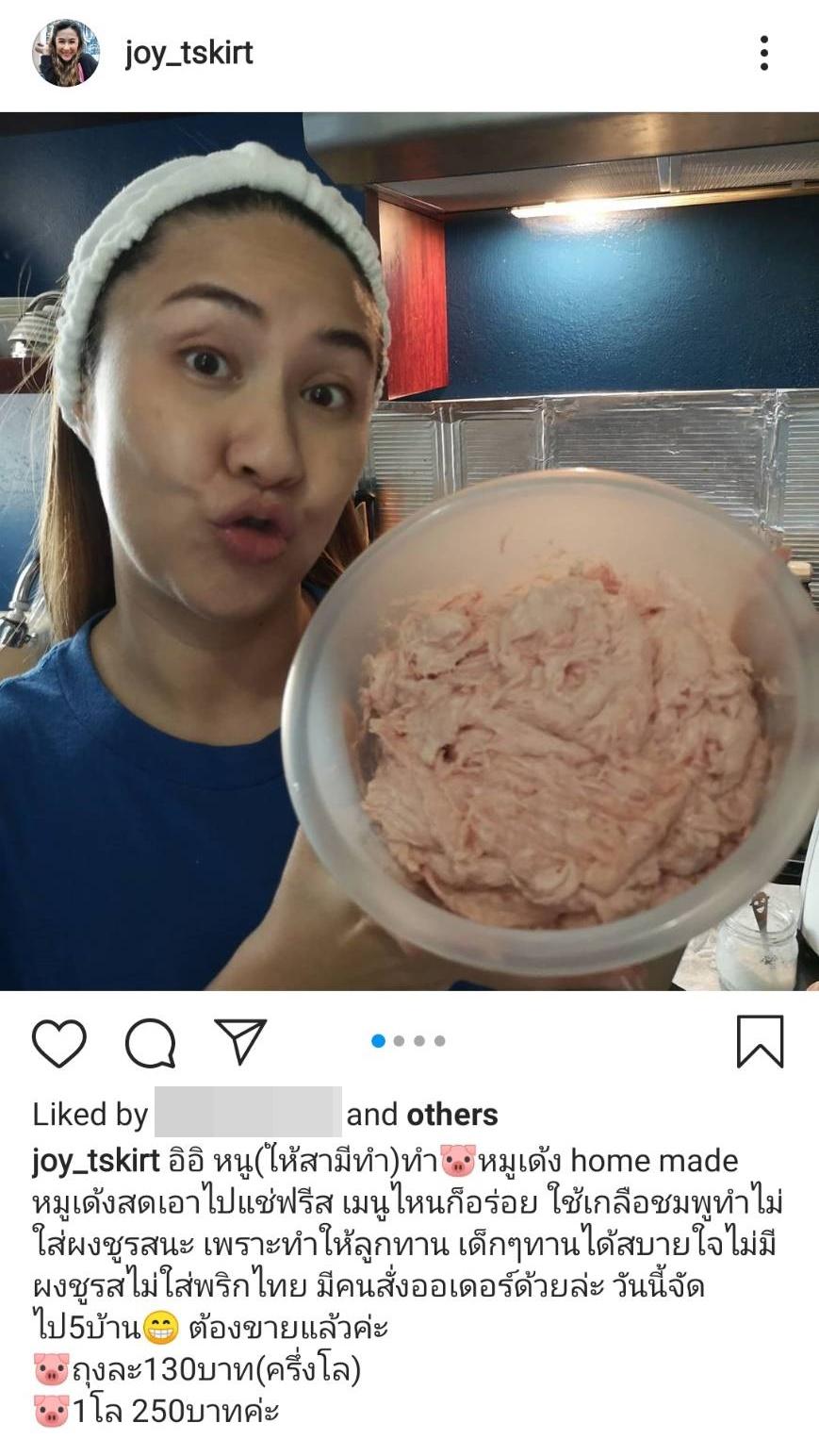 ใช้เกลือชมพูทำไม่ใส่ผงชูรสนะ เพราะทำให้ลูกทาน เด็กๆ ทานได้สบายใจไม่มีผงชูรสไม่ใส่พริกไทย มีคนสั่งออเดอร์ด้วยล่ะ วันนี้จัดไป 5 บ้าน ต้องขายแล้วค่ะ” อีกทั้งยังโพสต์ภาพข้อความ “พลิกโควิดให้เป็นโอกาส #แม่หมูเด้ง”