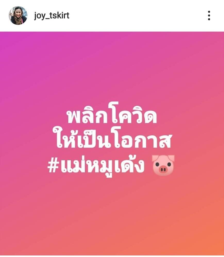 รวมไปถึงงานในวงการบันเทิงที่ต้องหยุดชะงักชั่วคราว ทำให้ต้องขาดรายได้ แต่ก็ไม่ทำให้นักร้องสาว จอย ธัญพร สนธิขันธ์ หรือ จอย ที-สเกิร์ต ท้อใจกับปัญหาที่เกิดขึ้น เดินหน้าขายหมูเด้ง รับทรัพย์แบบรัวๆ