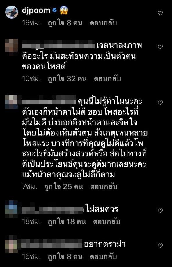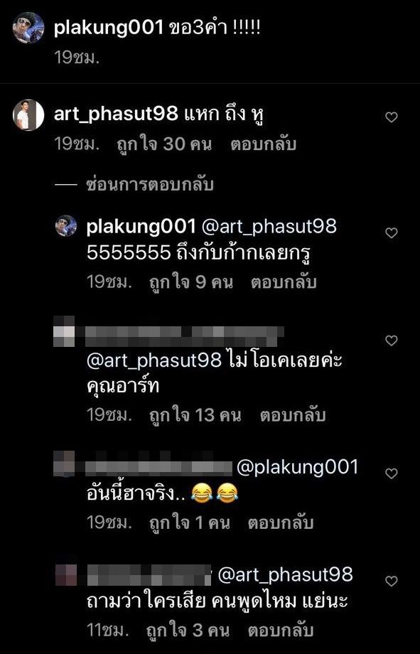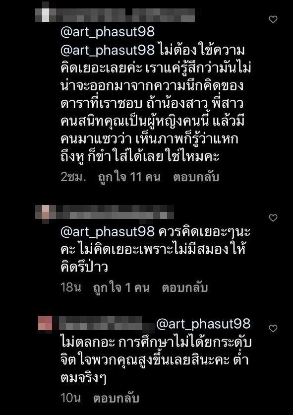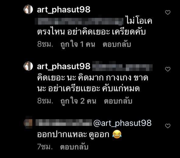 ซึ่งหลังจากที่เกิดดราม่า อาร์ต พศุตม์ ก็ได้คอมเมนต์ตอบกลับว่า “ไม่โอเคตรงไหน อย่าคิดเยอะ เครียดครับ” และตอบกลับอีกว่า “คิดเยอะนะ คิดมาก กางเกงขาดนะ อย่าเครียดเยอะครับแก่หมด”
