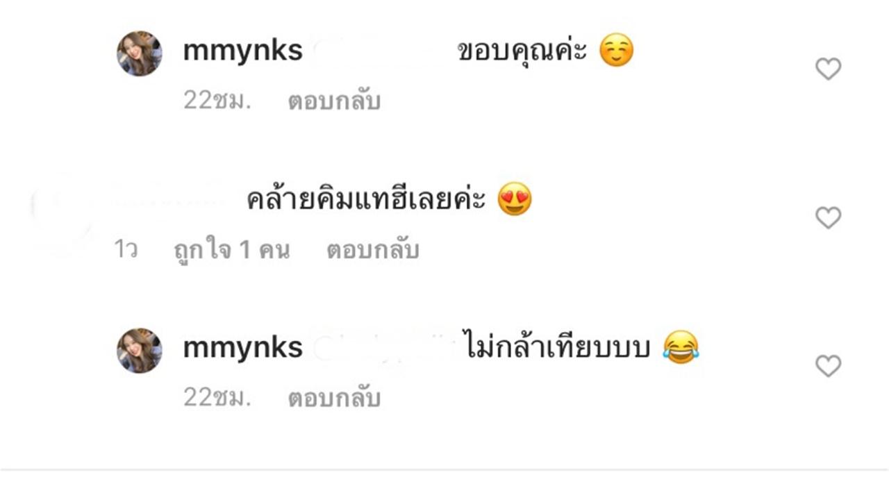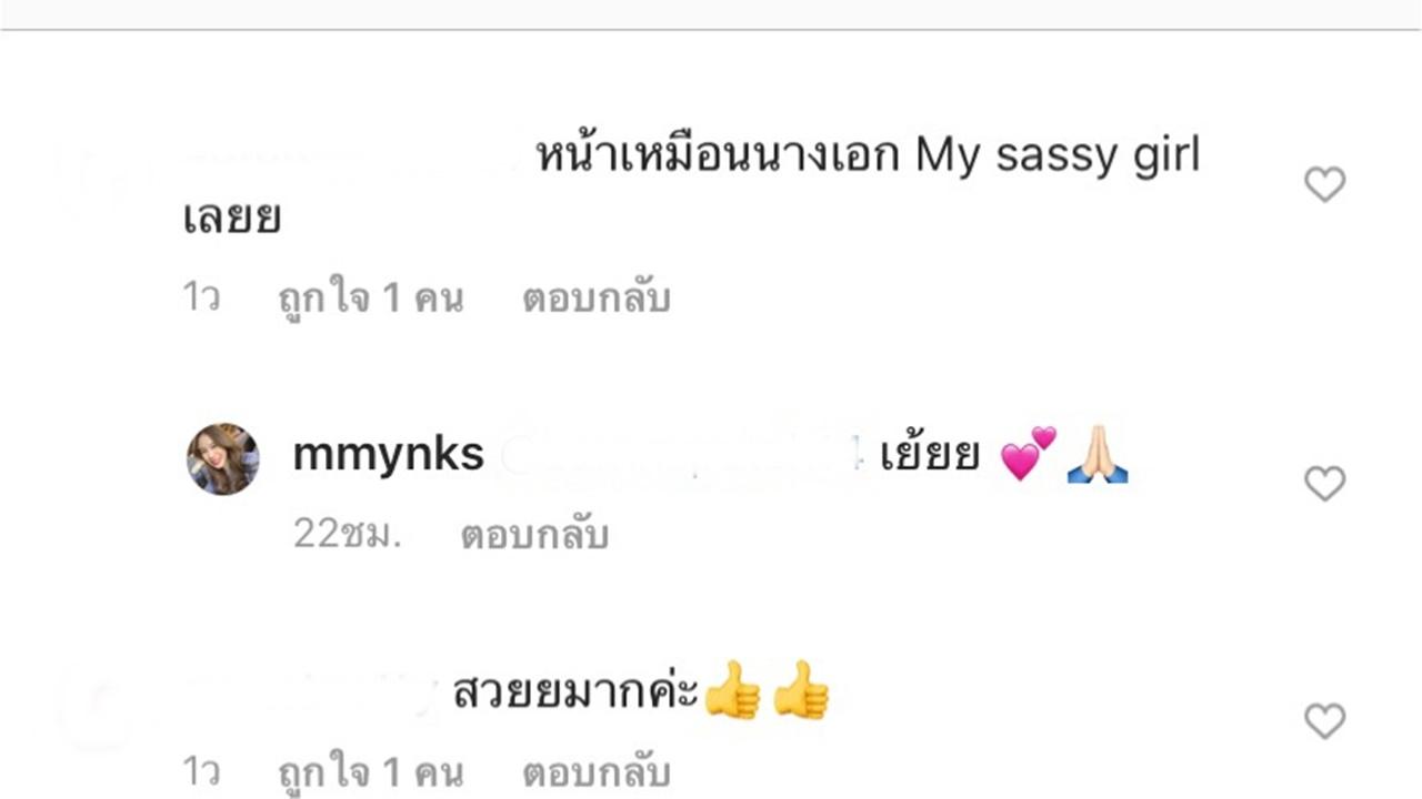 แต่มีบางคอมเมนต์ที่คอมเมนต์บอกว่า "หน้าเหมือนนางเอก My Sassy Girl" เลย ซึ่งสาวมิ้งก็คอมเมนต์ตอบว่า "เย้ยยย" พร้อมอีโมชั่นรูปหัวใจและไหว้ขอบคุณ และมีอีกคอมเมนต์ที่บอกว่า "คล้ายคิมแทฮีเลยค่ะ" ซึ่งเจ้าตัวก็บอกว่า "ไม่กล้าเทียบ" พร้อมอีโมชั่นรูป หัวเราะแต่มีน้ำตา
