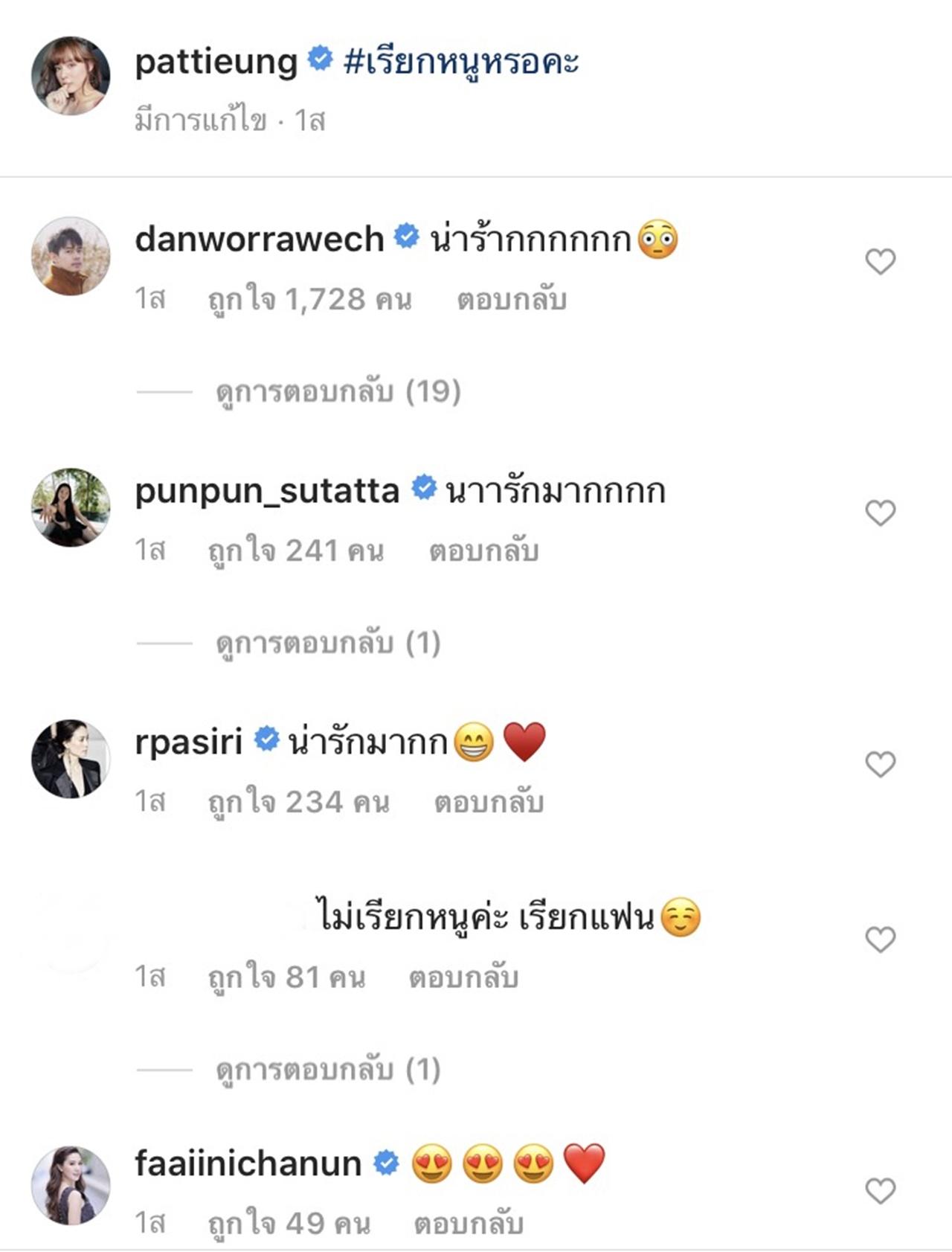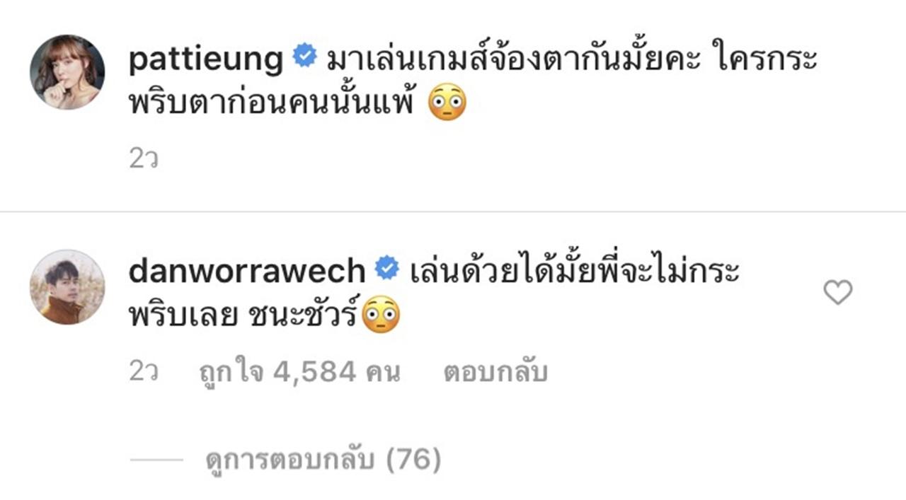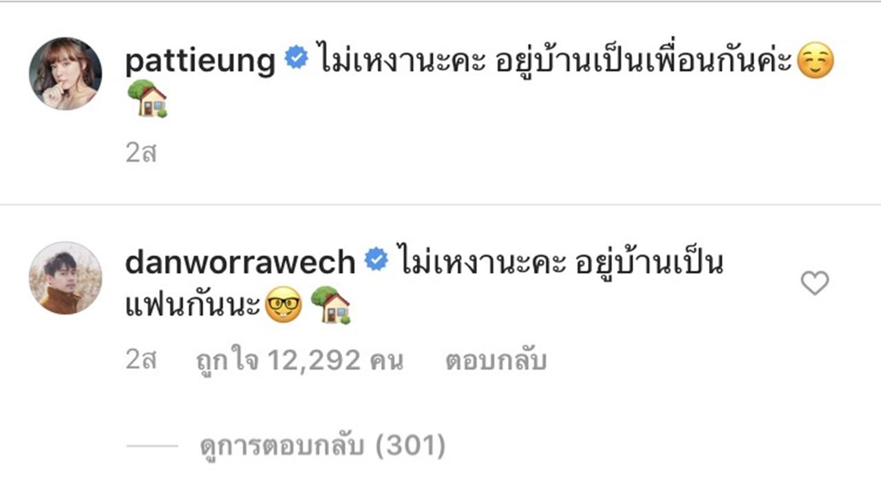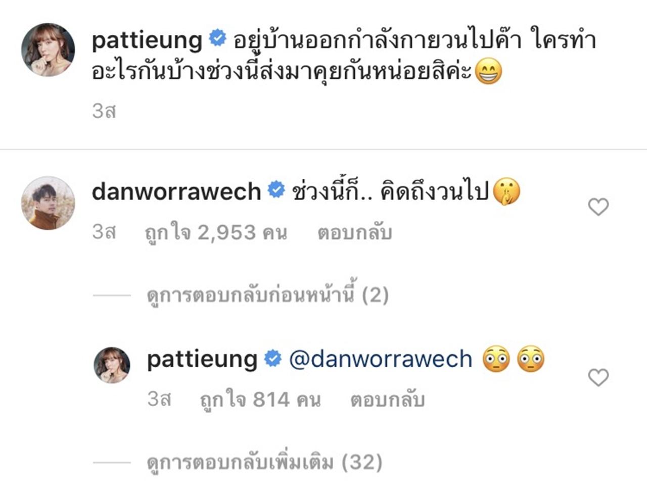 แม้จะไม่ได้เจอหน้ากันในช่วงนี้ แต่หนุ่มแดน ก็ขยันหยอดหวานถึงแฟนสาวอยู่บ่อยๆ ทั้งเข้าไปคอมเมนต์แซว แพทตี้ หยอดความรัก ความคิดถึง ทำเอาแฟนๆ ที่ติดตามเข้ามาแซว โดยบอกว่า หวงนะ ดูออก และบางคนบอกว่า ขอพื้นที่ตรงนี้เว้นไว้ให้แฟนคลับด้วย มาจีบกันแบบนี้ไม่เห็นใจหนุ่มๆ บ้างเลย