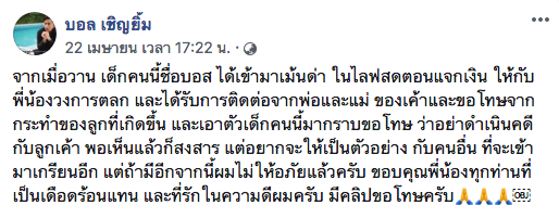 แต่ได้มีวัยรุ่นชายคนหนึ่งได้เข้ามาป่วนในไลฟ์สด โดยใช้ถ้อยคำที่ไม่สุภาพ ซึ่งต่อมา บอล ก็ได้โพสต์คลิปวิดีโอลงเฟซบุ๊ก ขณะต่อสายไปหาชายดังกล่าว