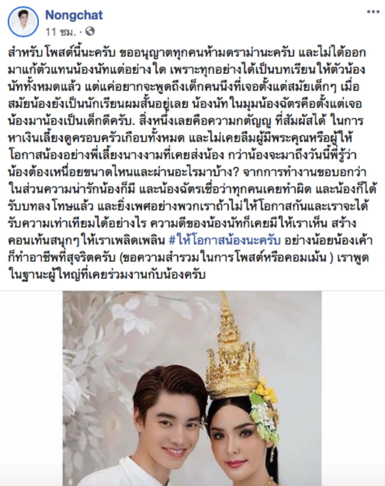 "สำหรับโพสต์นี้นะครับ ขออนุญาตทุกคนห้ามดราม่านะครับ และไม่ได้ออกมาแก้ตัวแทนน้องนัทแต่อย่างใด เพราะทุกอย่างได้เป็นบทเรียนให้ตัวน้องนัททั้งหมดแล้ว