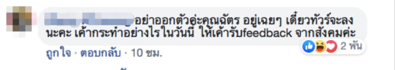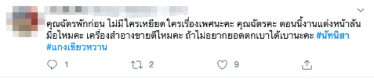 ซึ่งทันทีที่ น้องฉัตร โพสต์ก็มีชาวเน็ตมาแสดงความคิดเห็น "อย่าออกตัวค่ะคุณฉัตร อยู่เฉยๆ เดี๋ยวทัวร์จะลงนะคะ เค้ากระทำอย่างไรในวันนี้ ให้เค้ารับfeedback จากสังคมค่ะ", "คุณฉัตรพักก่อน ไม่มีใครเหยียดใครเรื่องเพศนะคะ คุณฉัตรคะ ตอนนี้งานแต่งหน้าล้นมือไหมคะ เครื่องสำอางขายดีไหมคะ ถ้าไม่อยากยอดตกเบาได้เบานะคะ #นัทนิสา #แกงเขียวหวาน".