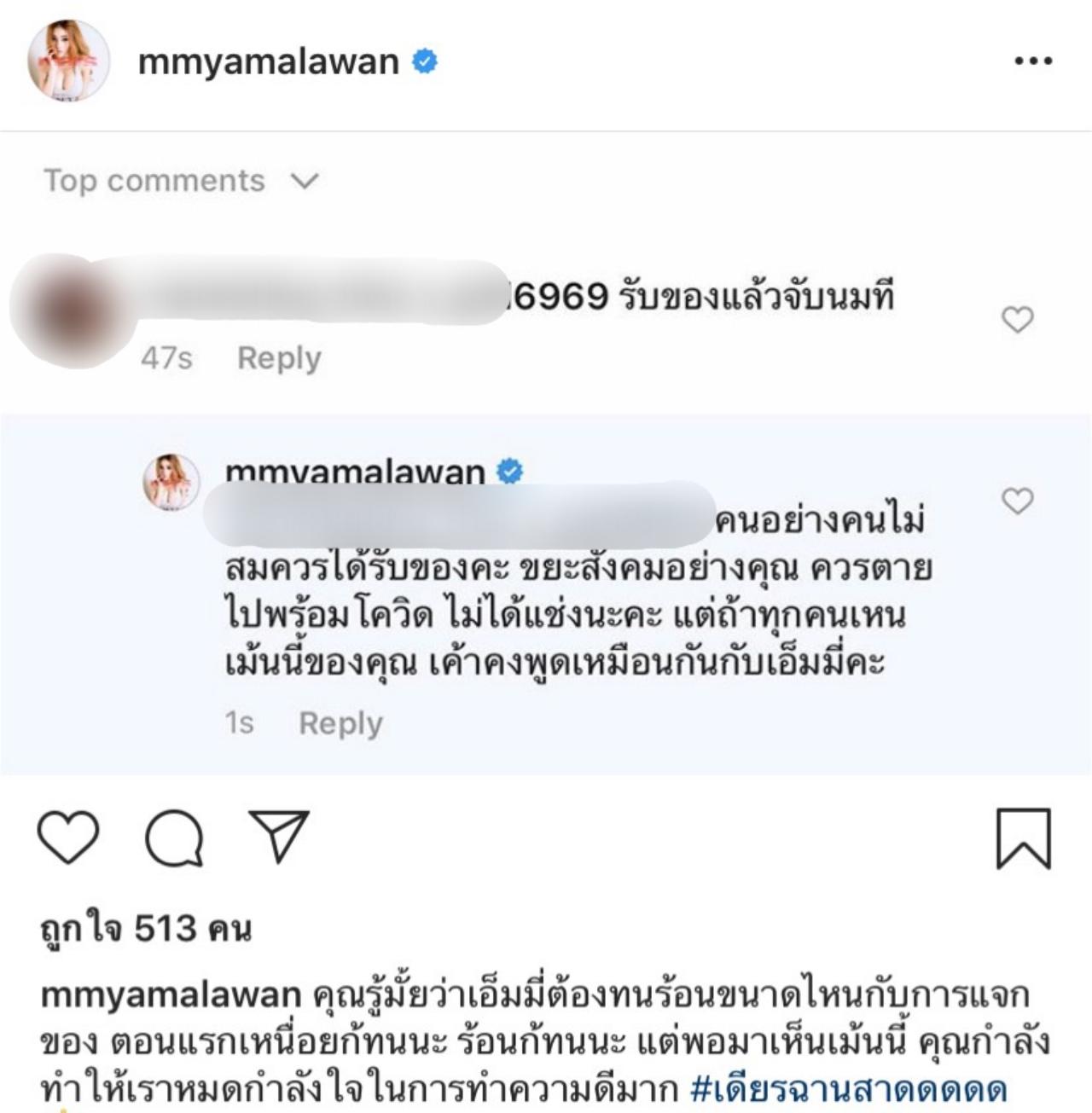 งานนี้ทำเอาสาว เอมมี่ แม็กซิม เดือดจัดพร้อมกับแคปข้อความดังกล่าวออกมาโพสต์ประจาน พร้อมด้วยคำพูดตัดพ้อว่า "คุณรู้ไหมว่าเอมมี่ต้องทนร้อนขนาดไหนกับการแจกของ ตอนแรกเหนื่อยก็ทนนะ ร้อนก็ทนนะ แต่พอมาเห็นเมนต์นี้ คุณกำลังทำให้เราหมดกำลังใจในการทำความดีมาก"