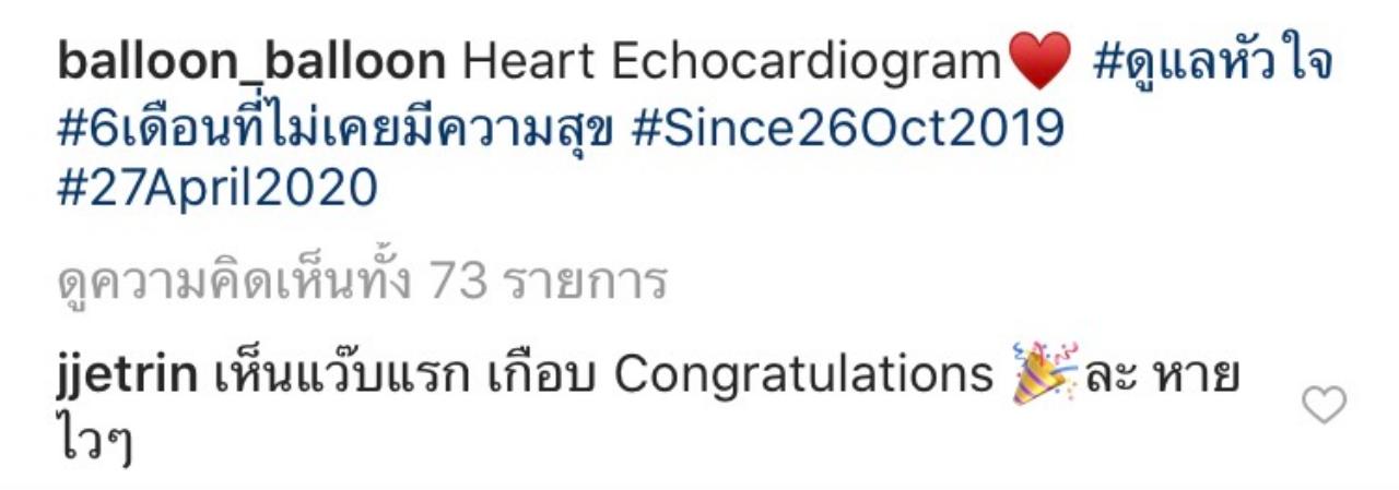 ซึ่งแฟนๆ ที่ติดตาม รวมไปถึง เจ เจตริน ก็ได้เข้ามาคอมเมนต์ให้กำลังใจ พร้อมกับถามไถ่อาการป่วยของ บอลลูน กันเป็นจำนวนมาก