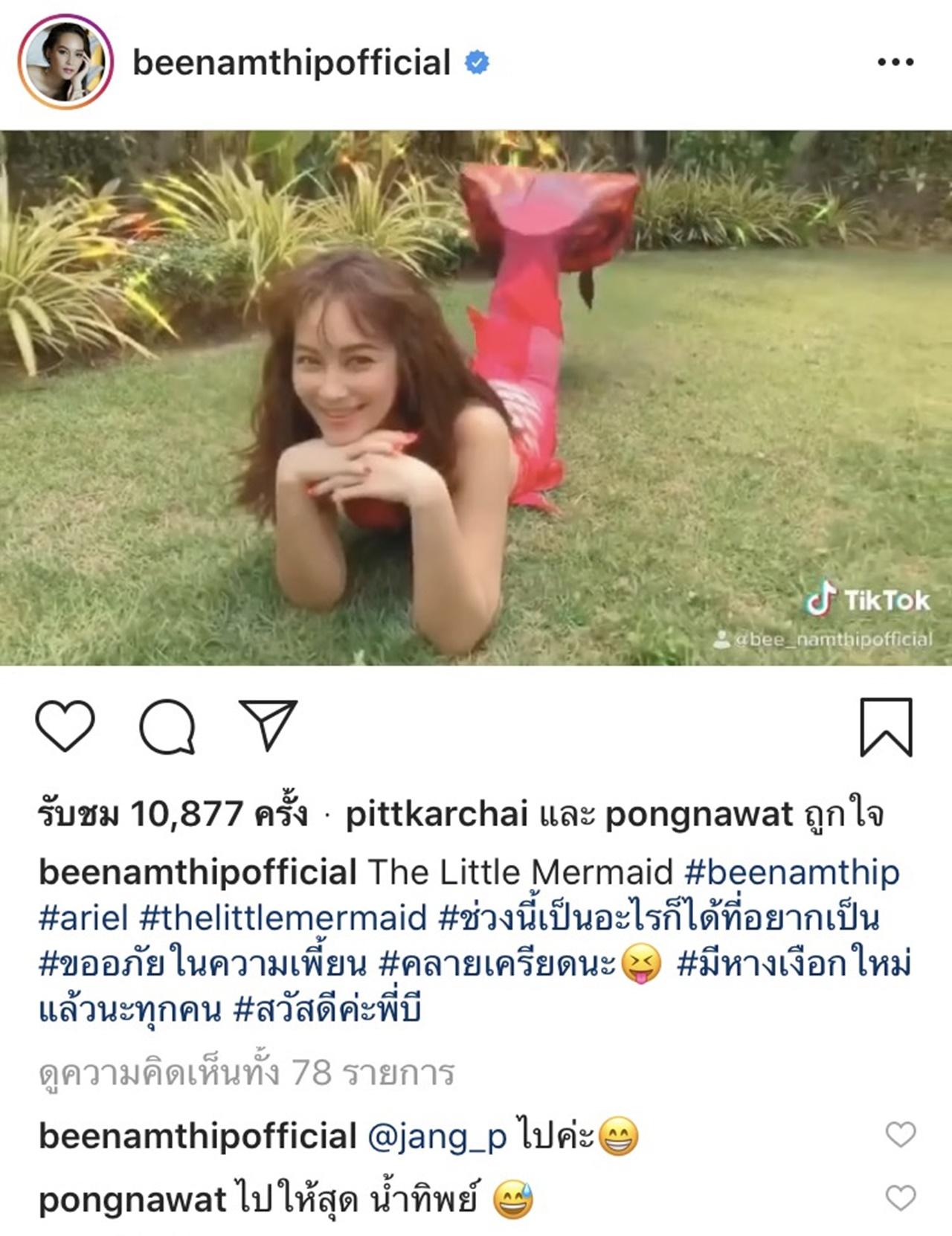 ล่าสุด บี ก็ได้งัดชุดนางเงือกสีแดงสวยออกมาใส่ นอนกลิ้งกับสนามหญ้าหน้าบ้าน พร้อมอัดคลิปลงในติ๊กต๊อก และเขียนแคปชั่นว่า "The Little Mermaid #beenamthip #ariel #thelittlemermaid #ช่วงนี้เป็นอะไรก็ได้ที่อยากเป็น #ขออภัยในความเพี้ยน #คลายเครียดนะ #มีหางเงือกใหม่แล้วนะทุกคน #สวัสดีค่ะพี่บี"