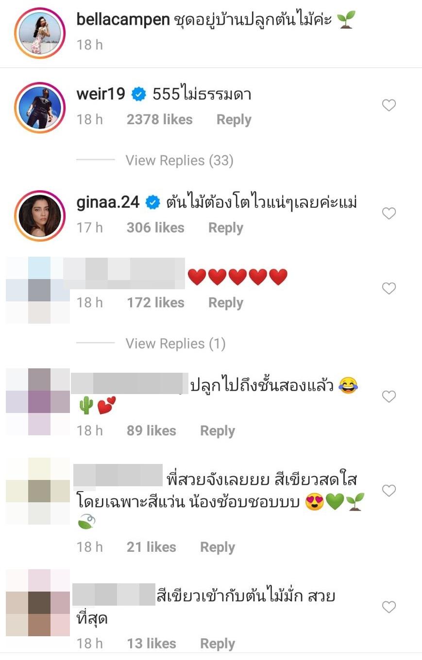 นอกจากจะมีแฟนๆ แห่คอมเมนต์แซวว่าเป็นชุดอยู่บ้านปลูกต้นไม้ที่เท่มาก ชุดแมตช์มาก สวย น่ารัก แสนดี รักธรรมชาติ ฯลฯ หนุ่มรู้ใจอย่าง เวียร์ ศุกลวัฒน์ ก็ไม่พลาดเข้ามาคอมเมนต์แซวว่า “555 ไม่ธรรมดา” ด้วย งานนี้แฟนๆ แห่กดไลค์และคอมเมนต์ถึงเวียร์ว่าแซวเก่งด้วย.