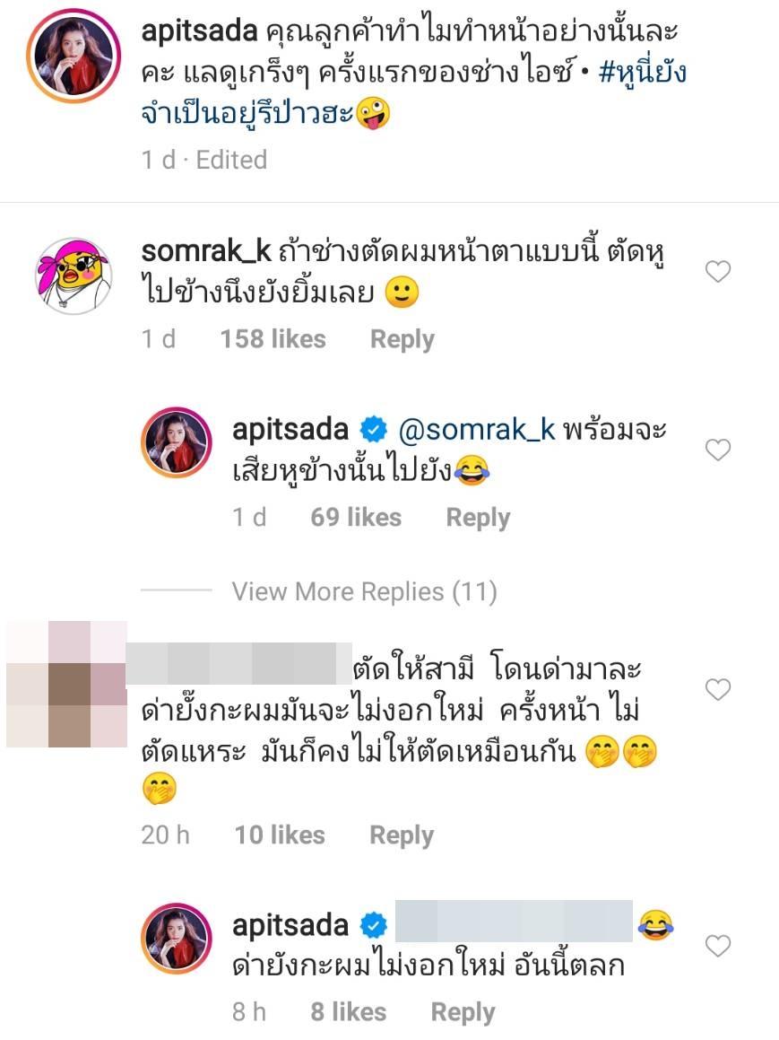 และแน่นอนว่าแฟนพันธุ์แท้อย่างเจ้าของเพจดัง อีเจี๊ยบ เลียบด่วน เข้ามาคอมเมนต์แซวว่า “ถ้าช่างตัดผมหน้าตาแบบนี้ ตัดหูไปข้างนึงยังยิ้มเลย” ก่อนที่ ไอซ์ อภิษฎา จะตอบกลับว่า “พร้อมจะเสียหูข้างนั้นไปยัง” งานนี้เลยมีคนคอมเมนต์แซวอีกเพียบ.
