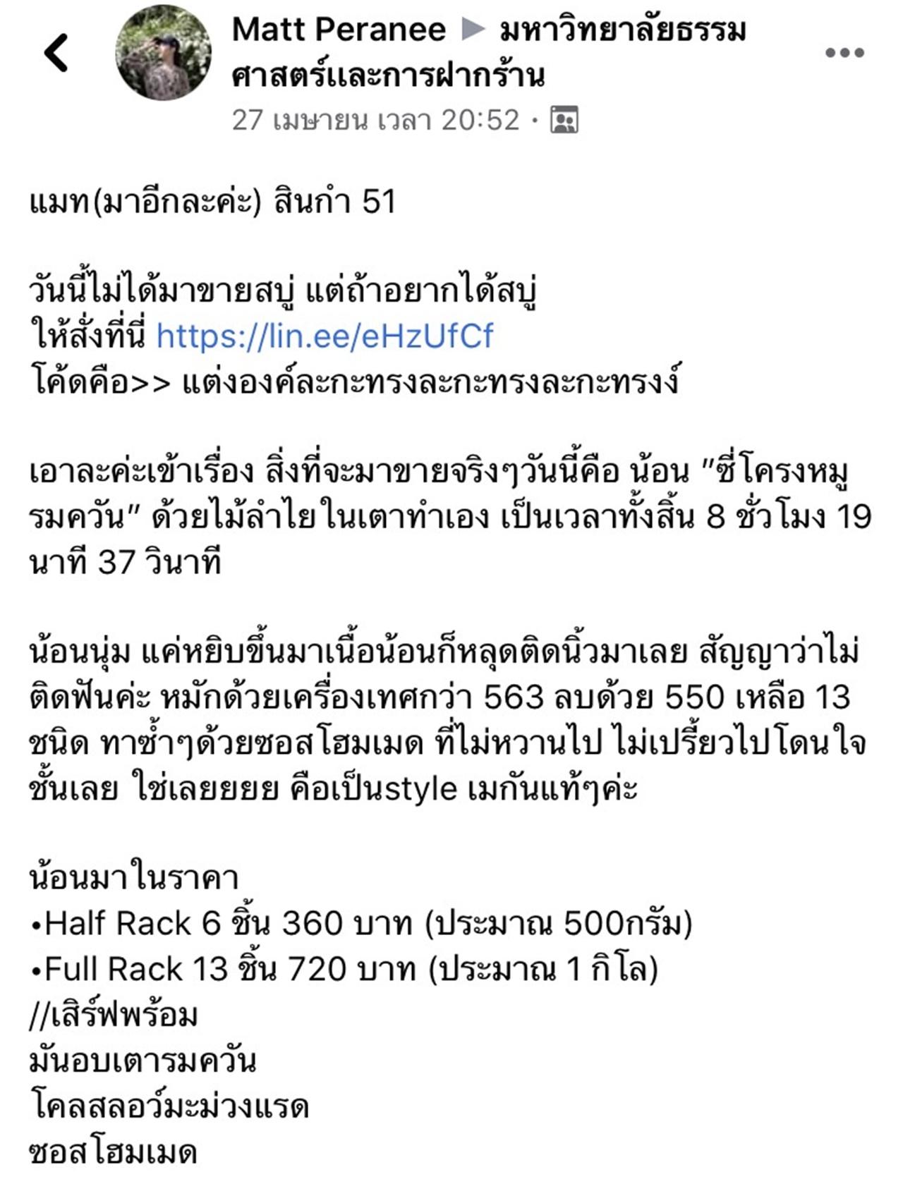 ขณะที่ แมท ภีรนีย์ ก็ได้เข้าไปโพสต์ในกลุ่ม มหาวิทยาลัยธรรมศาสตร์และการฝากร้าน ที่เธอได้เรียนจบมา โดยฝากร้านช่วย สงกรานต์ ขายซี่โครงรมควัน และได้การตอบรับดีมากอีกด้วย