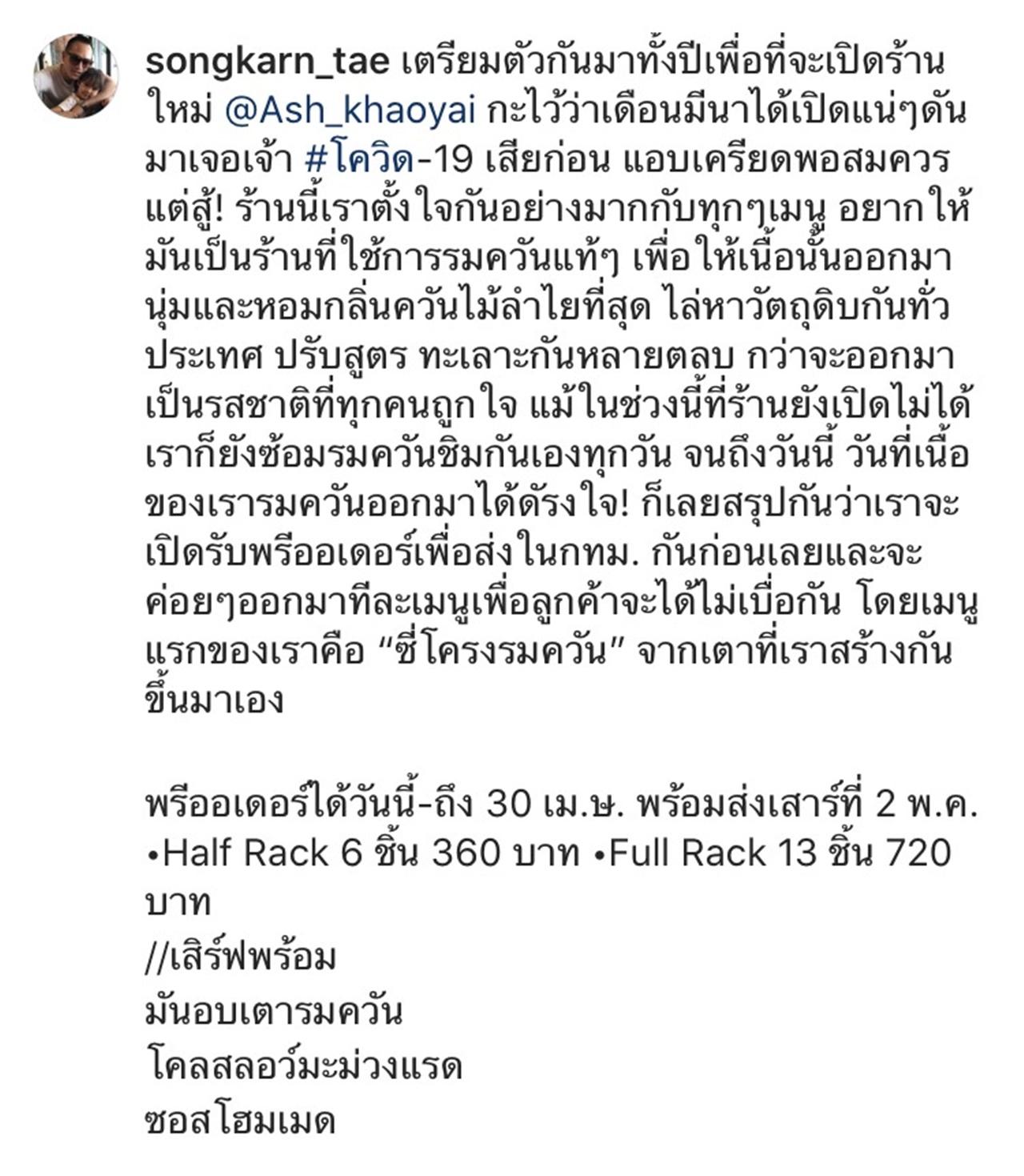 ล่าสุด สงกรานต์ ก็ได้เปิดขายเมนูรมควันจากไม้ลำไย ซึ่งเปิดส่งแบบเดลิเวอรี่ในเขตกรุงเทพฯ โดยเมนูแรกก็คือ ซี่โครงรมควัน และได้โพสต์ถึงเมนูนี้ผ่านทางอินสตาแกรมของตัวเอง ซึ่งคนที่ติดตามต่างเข้ามาคอมเมนต์อยากชิมกันเป็นจำนวนมาก และสงกรานต์ ก็ตอบกลับทุกคอมเมนต์