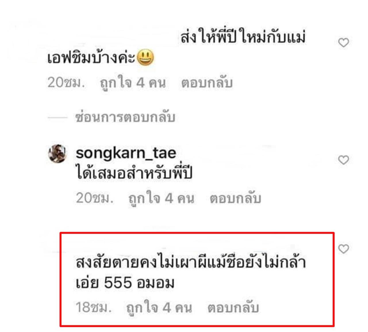 แต่ก็ยังมีชาวเน็ตบางคนได้เข้ามาคอมเมนต์ว่า "ส่งให้พี่ปีใหม่กับแม่แอฟชิมบ้างค่ะ" และ สงกรานต์ ก็ได้ตอบกลับว่า "ได้เสมอสำหรับพี่ปี" และชาวเน็ตอีกคนก็เข้ามาแซะแรงว่า "สงสัยตายคงไม่เผาผี แม้แต่ชื่อยังไม่กล้าเอ่ย"