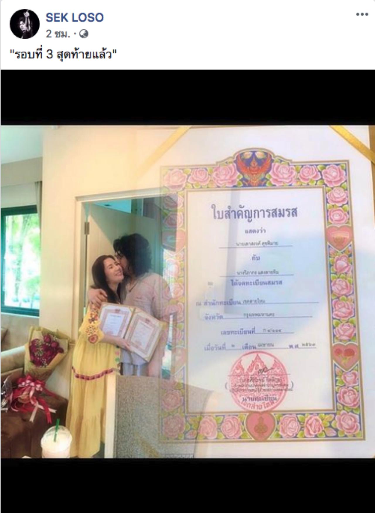 ถือเป็นเรื่องราวดีๆ มากจริงๆ สำหรับครอบครัวของ เสก โลโซ ร็อกเกอร์ชื่อดัง กับภรรยา กานต์ วิภากร ที่ล่าสุดทั้งคู่ได้โพสต์ภาพใบจดทะเบียนสมรส พร้อมกับยืนกอดกันอย่างมีความสุข ประกาศสถานะกลับมาเป็นชีวิตคู่กันอย่างเป็นทางการ หลังจากต้องเจอกับเรื่องราวดราม่าต่างๆ มาหลายปี