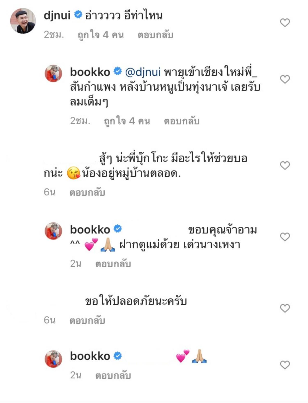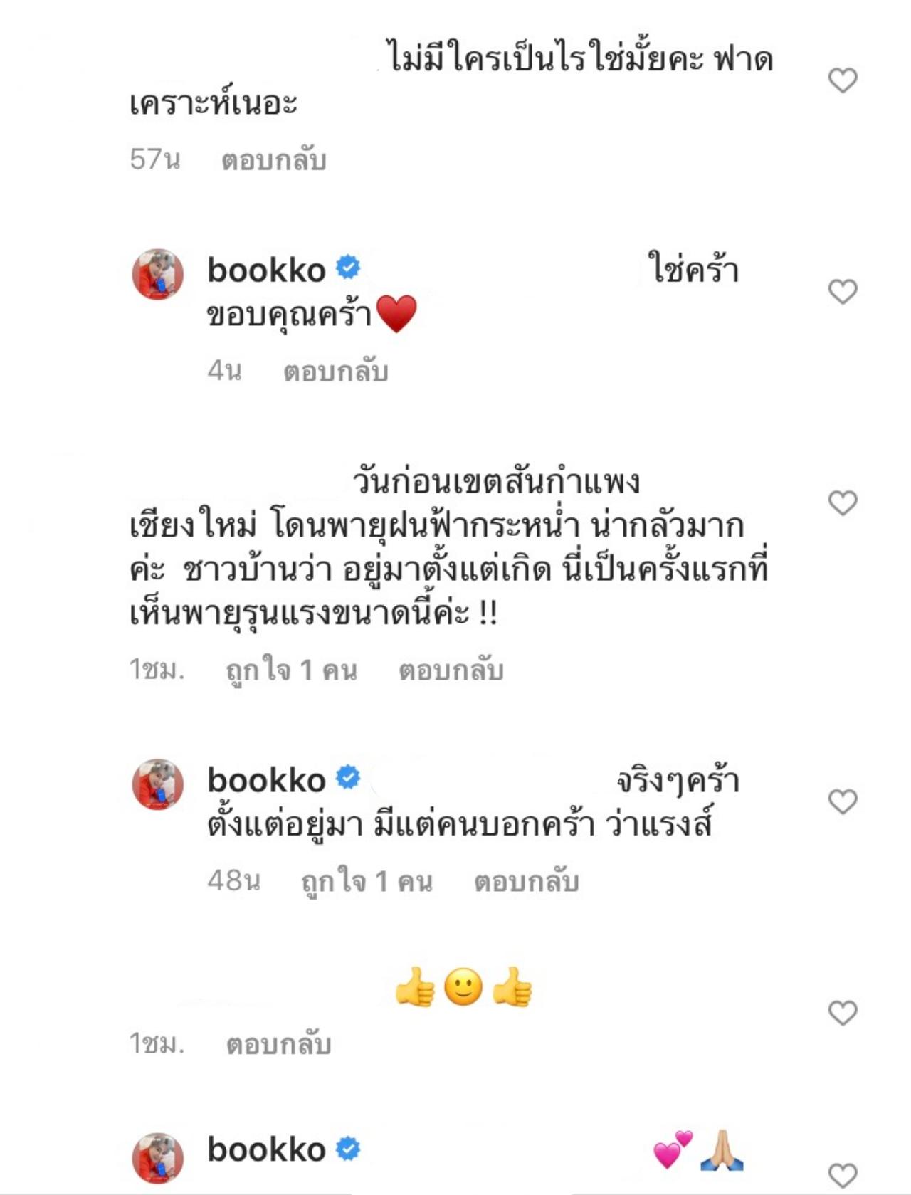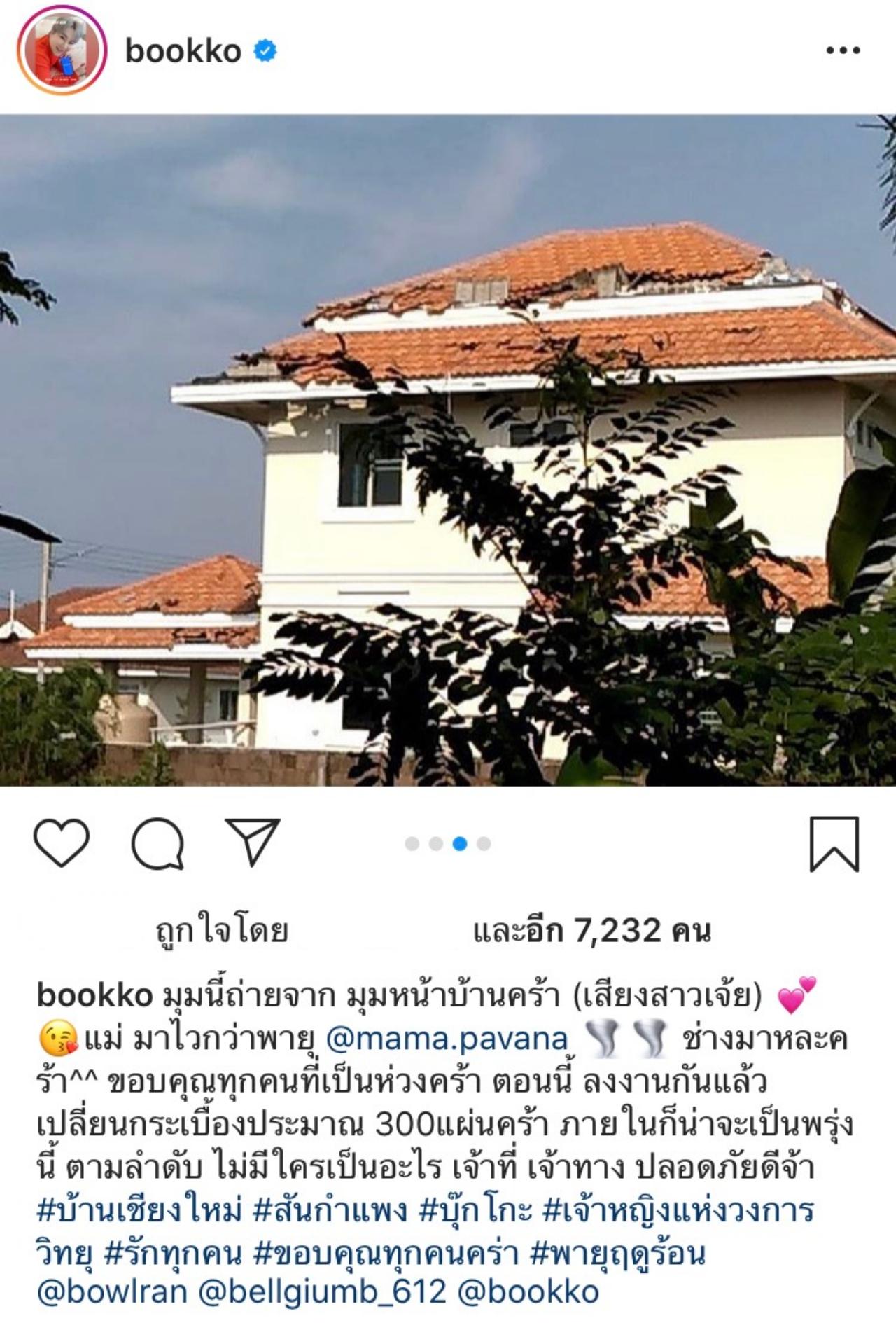 และล่าสุด บุ๊คโกะ ก็ได้โพสต์ภาพที่ช่างกำลังเข้าไปซ่อมบ้าน ซึ่งต้องเปลี่ยนกระเบื้องบนหลังคาบ้านประมาณ 300 แผ่น ส่วนภายในบ้านก็จะค่อยๆ ทำไปตามลำดับ และมีคุณแม่คอยมาคุมงานอยู่ ตนเองและครอบครัวปลอดภัยดี เพราะไม่มีใครอยู่บ้านหลังนี้ อีกทั้งหลังบ้านติดทุ่งนา ไม่มีอะไรช่วยบัง เลยทำให้เสียหายไปเต็มๆ