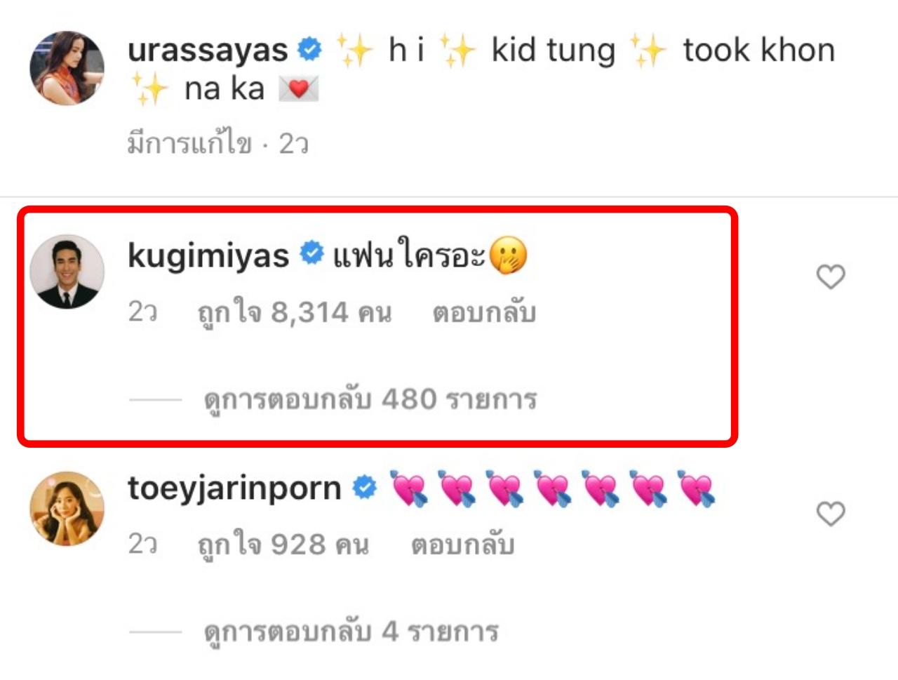 ล่าสุด ญาญ่า ก็ได้โพสต์ภาพตัวเองในอิริยาบถน่ารักๆ ลงอินสตาแกรม พร้อมกับเขียนข้อความบอกคิดถึงทุกคน และ ณเดชน์ ก็เข้ามาคอมเมนต์อย่างไวว่า "แฟนใครอะ"