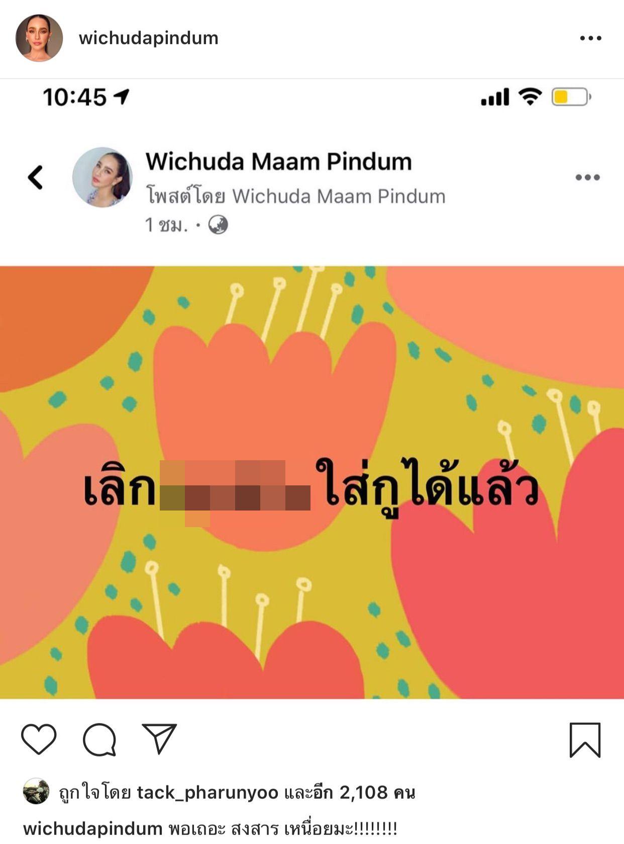 แต่ก็ไม่รู้ว่ามีใครทำให้ แหม่ม วิชุดา อารมณ์ไม่ดี ออกอาการของขึ้น เพราะล่าสุดเจ้าตัวโพสต์ข้อความในเฟซบุ๊กรวมถึงไอจีส่วนตัวว่า “เลิกตอแ_ลใส่_ูได้แล้ว” พร้อมทั้งเขียนแคปชั่น “พอเถอะ สงสาร เหนื่อยมะ!!!!!!!!” เล่นเอาสะดุ้งโหยงกันเลยทีเดียว