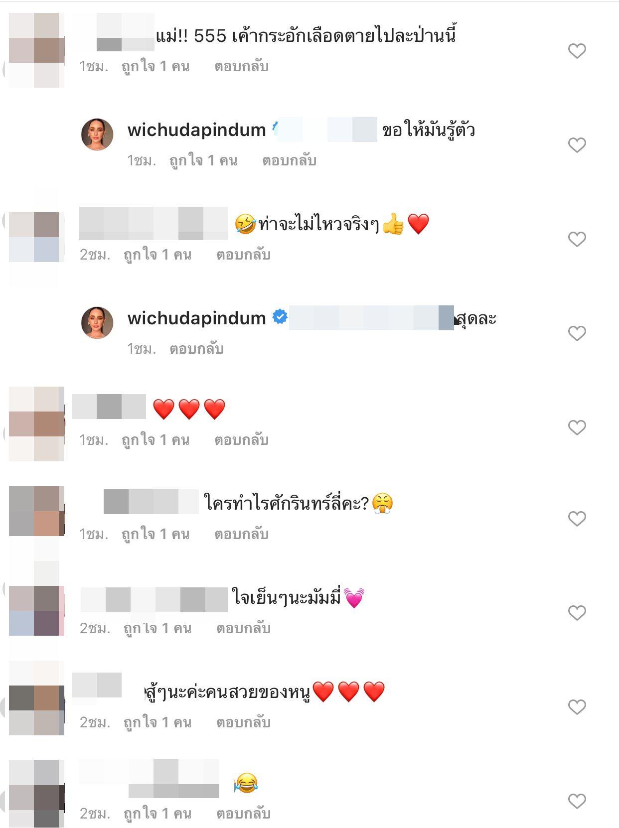 งานนี้เลยมีแฟนๆ เข้ามาคอมเมนต์แสดงความคิดเห็นมากมาย อาทิ สงสัยกระอักเลือดตายไปแล้ว ท่าจะไม่ไหวจริงๆ บ้างก็ถามว่าใครทำอะไรให้โกรธ บ้างก็บอกให้ใจเย็นๆ รวมทั้งส่งกำลังใจถึงเจ้าตัวด้วย แต่ล่าสุด แหม่ม วิชุดา ลบโพสต์ดังกล่าวออกจากเฟซบุ๊กและไอจีแล้ว