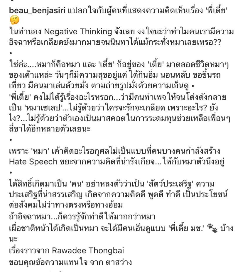 "แปลกใจกับผู้คนที่แสดงความคิดเห็นเรื่อง 'พี่เตี้ย' ในทำนอง Negative Thinking จังเลย งงใจนะว่าทำไมคนเรามีความอิจฉาหรือเกลียดชังมากมายจนนินทาได้แม้กระทั่งหมาเลยเหรอ??