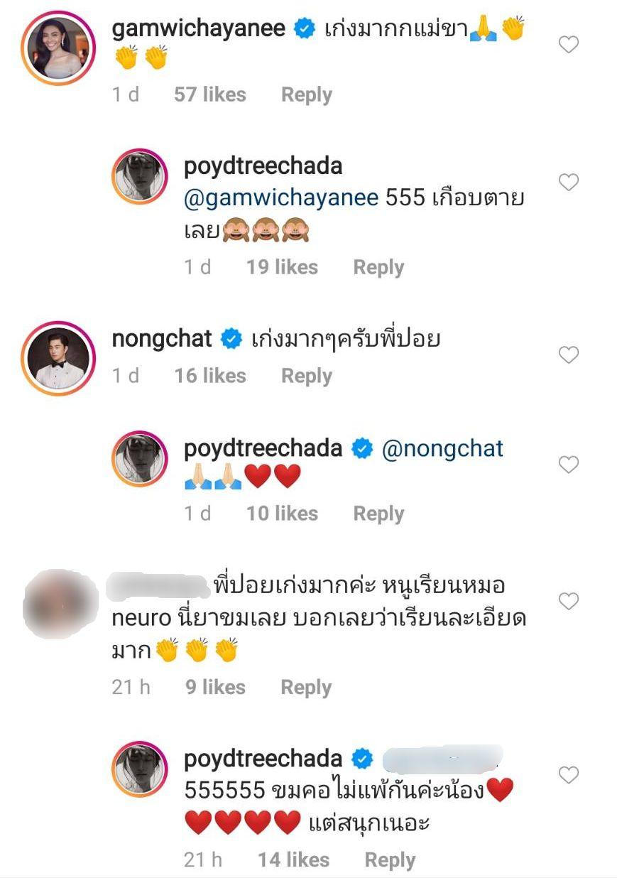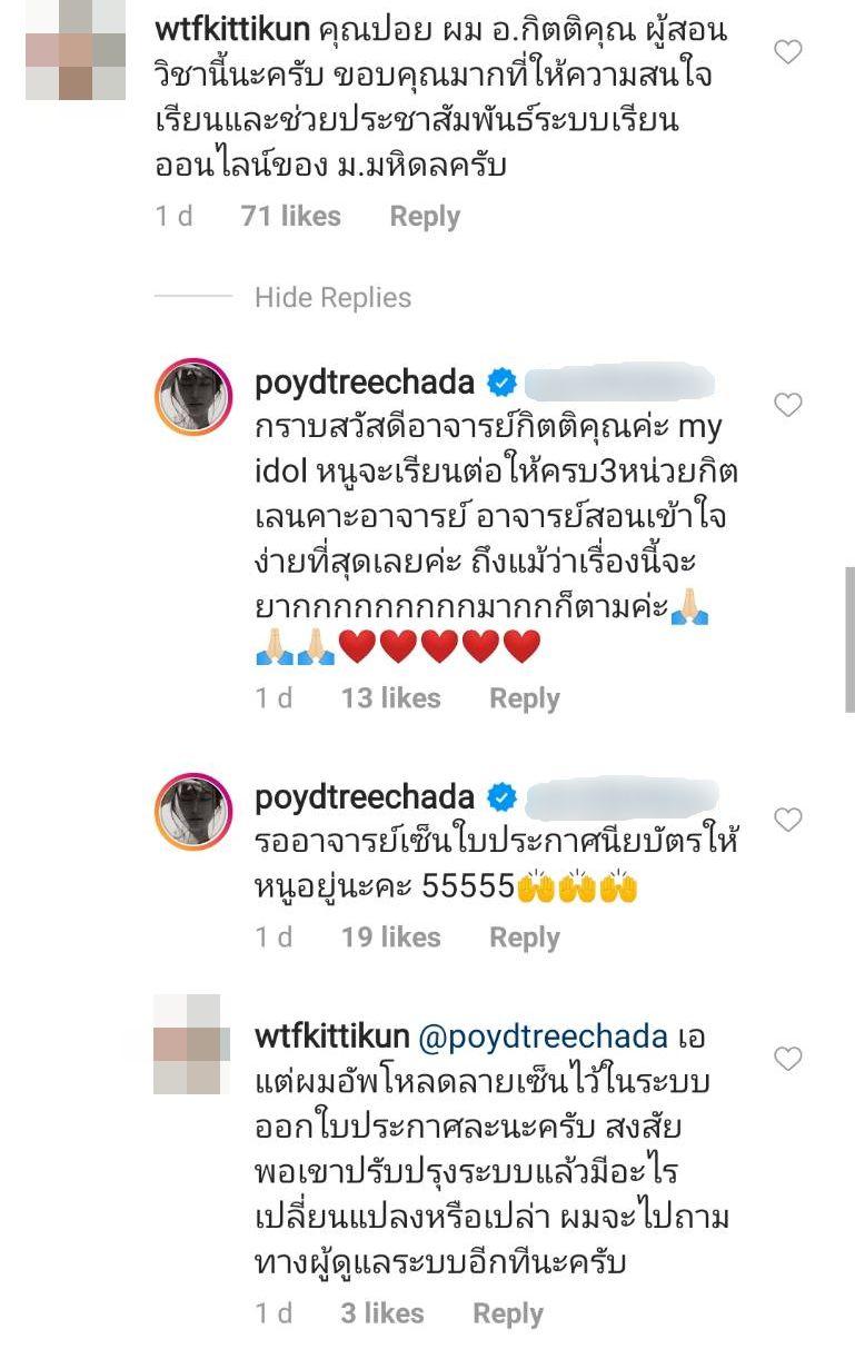ซึ่งหลังจากนั้นก็มีเพื่อนๆ ในวงการบันเทิง ตลอดจนแฟนๆ คอมเมนต์ชื่นชมและแสดงความยินดีเป็นจำนวนมาก อีกทั้งยังมีอาจารย์ที่สอนวิชาดังกล่าวเข้ามาคอมเมนต์ขอบคุณที่ให้ความสนใจเรียนและช่วยประชาสัมพันธ์ระบบการเรียนออนไลน์ และ ปอย ตรีชฎา ตอบกลับว่า “กราบสวัสดีอาจารย์กิตติคุณค่ะ my idol หนูจะเรียนต่อให้ครบ 3 หน่วยกิตเลยค่ะอาจารย์ อาจารย์สอนเข้าใจง่ายที่สุดเลยค่ะ ถึงแม้ว่าเรื่องนี้จะยากกกกกกกกกมากกก็ตามค่ะ”.