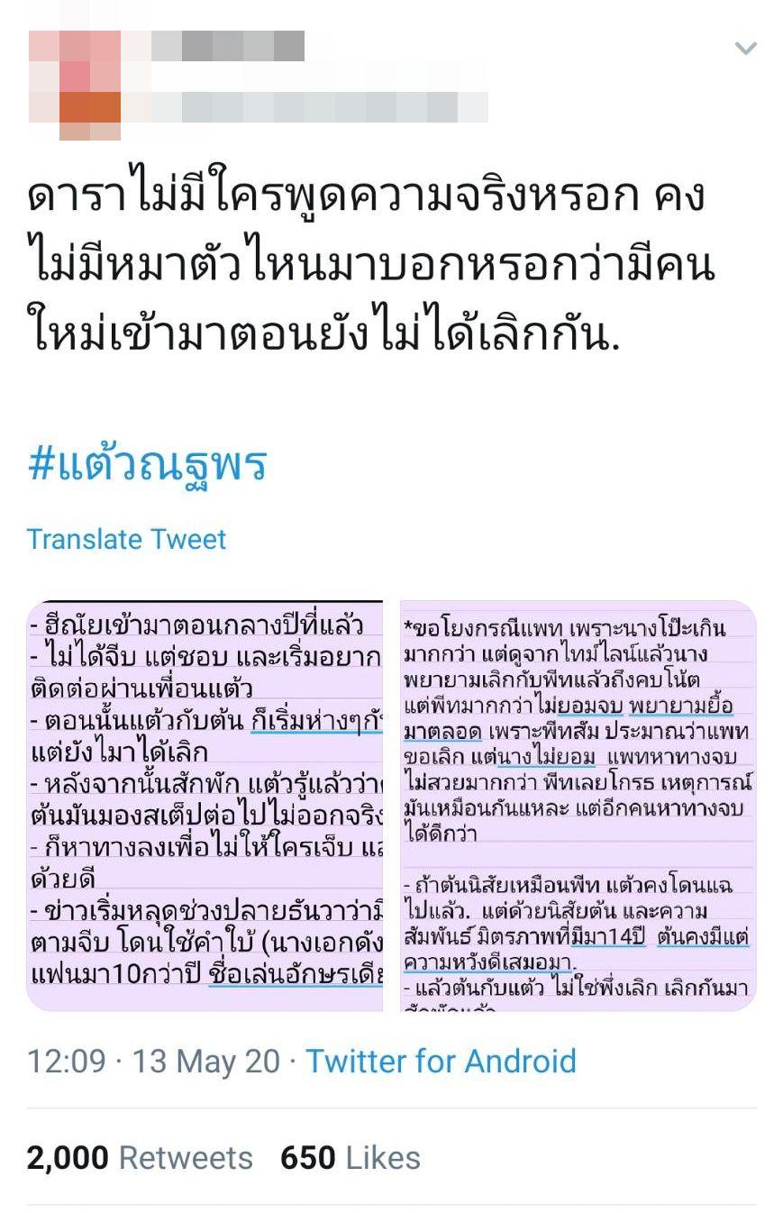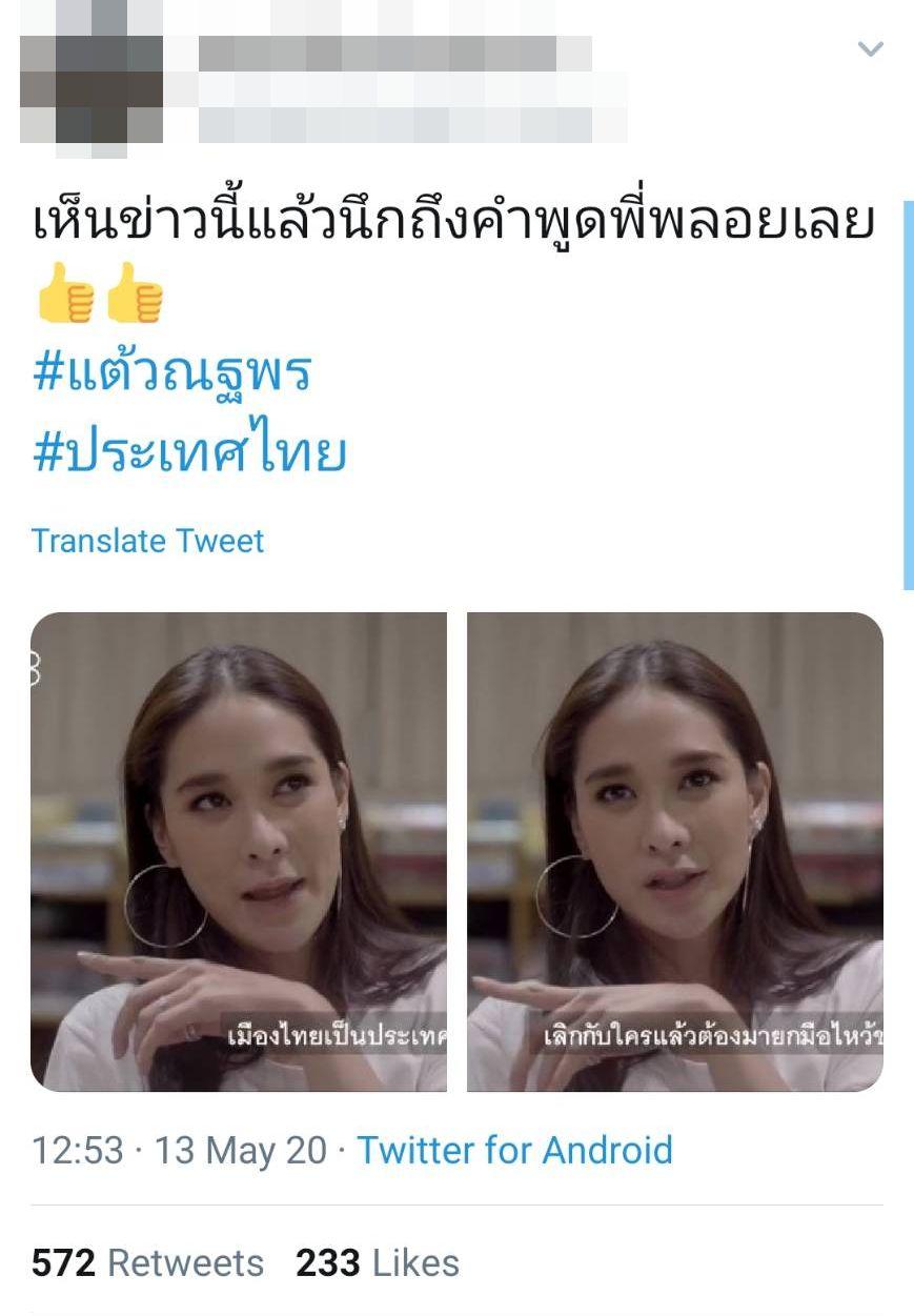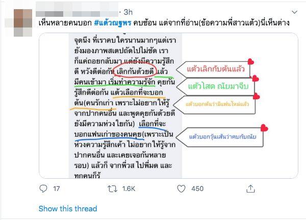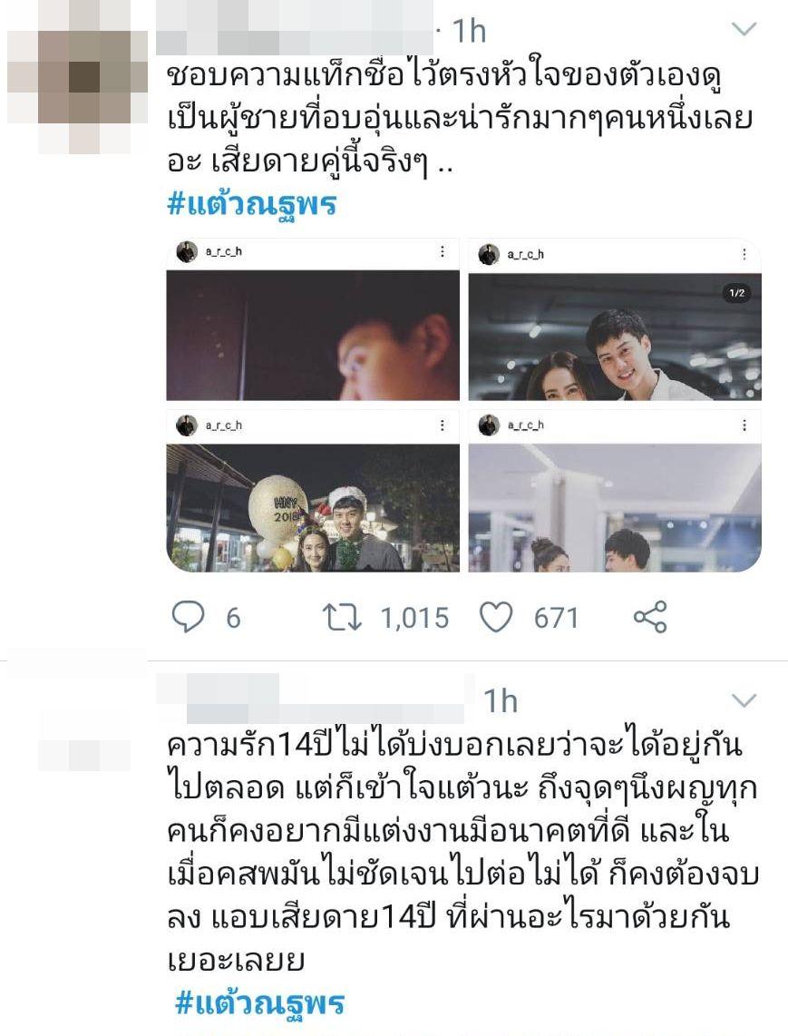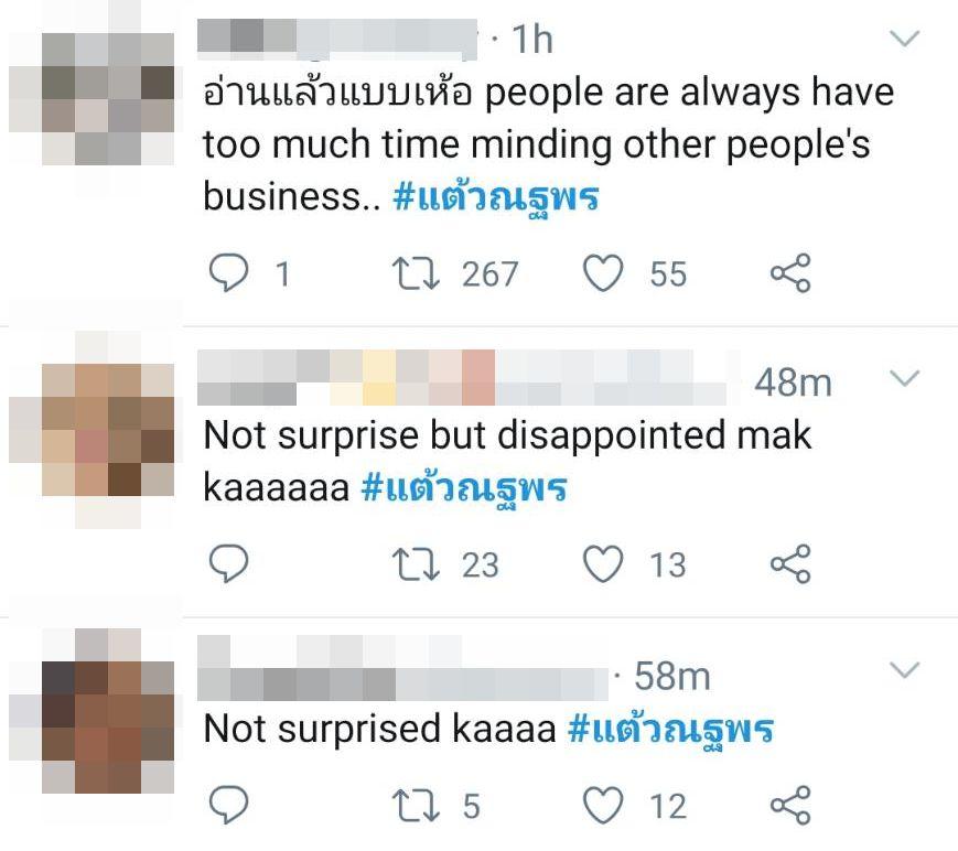 งานนี้แฮชแท็ก #แต้วณฐพร กลับมาติดเทรนด์ทวิตเตอร์อีกรอบในอันดับที่ 3 แต่ครั้งนี้ชาวเน็ตเสียงแตก มีทั้งแสดงความเห็นด้านบวกและลบ บ้างก็มองว่า แต้ว คบซ้อน คือคุยกับ ไฮโซณัย ตั้งแต่ยังไม่เลิกกับ ต้น แต่บางส่วนกลับมองว่า แต้วเลิกกับต้นแล้ว พอโสดแล้วไฮโซณัยมาจีบ และแต้วบอกกับต้นว่ามีคนใหม่แล้ว อีกทั้งบอกกับวุ้นเส้นถึงเรื่องนี้ด้วยเช่นกัน