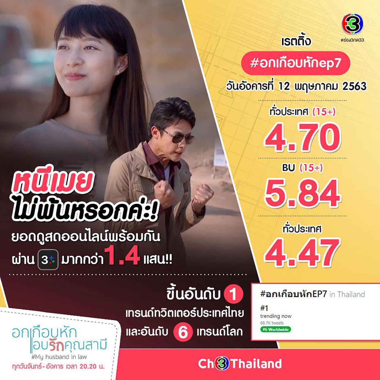 ของดี ไม่พูดเยอะ เพราะเรตติ้งมันฟ้องว่า ปังติดเทรนด์โลก!! สำหรับ ละครฟีลกู๊ด “อกเกือบหักแอบรักคุณสามี” ทางช่อง 3 ของผู้จัด “แอน ทองประสม” ซึ่งสัปดาห์นี้ กระแสโซเชียลวิ่งแรง แซงทุกความสนุก จนติดเทรนด์ทวิตเตอร์อันดับ 6 ของโลก และยังคงรักษาความเก๋า ติดเทรนด์ทวิตเตอร์ อันดับ 1 ประเทศไทย ได้อย่างสวยงาม ด้านเรตติ้งก็ดีดสูงขึ้นทุกตอนอย่างต่อเนื่อง ล่าสุด EP.7 เรตติ้งในกลุ่ม 15+BU (กลุ่มผู้ชมที่มีอายุตั้งแต่ 15 ปีขึ้นไป ในเขตกรุงเทพฯ และหัวเมืองใหญ่) สูงถึง 5.84 ส่วนกลุ่ม 15+NA (กลุ่มผู้ชมที่มีอายุ 15 ปีขึ้นไป ทั่วประเทศ) อยู่ที่ 4.70 โดยภาพรวมเรตติ้งเฉลี่ยทั่วประเทศ 4.47 ส่วนยอดดูสดออนไลน์ผ่านแอป CH3+ มากกว่า 1.4 แสน เรียกว่ากระแสความนิยมของพระนางสายฟีลกู๊ด อย่าง “หมาก ปริญ” และ “มิว นิษฐา” ยังคงสะกดคนดูได้อยู่หมัด ทั้งนี้ หมากแอบบอกใบ้เบาๆ ว่า เตรียมฟิน ฮา น้ำตาแตกยาวไป