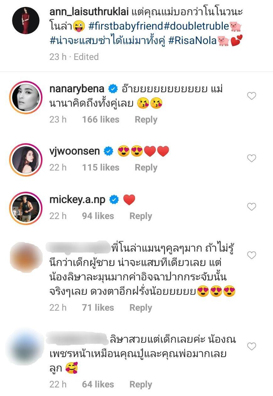 จากนั้น แอน อลิชา ก็โพสต์ภาพ น้องลิษา คู่กับ น้องโนล่า และเขียนแคปชั่น “แต่คุณแม่บอกว่าโนโนวนะโนล่า #firstbabyfriend#doubletruble #น่าจะแสบซ่าได้แม่มาทั้งคู่ #RisaNola” และ นานา ไรบีนา ตามมาคอมเมนต์ว่า “อ๊ายยยยยยยยยยย แม่นานาคิดถึงทั้งคู่เลย” ส่วน มิกกี้ นนท์ อัลภาชน์ ณ ป้อมเพชร คุณพ่อน้องโนล่า คอมเมนต์เป็นอีโมจิรูปหัวใจ