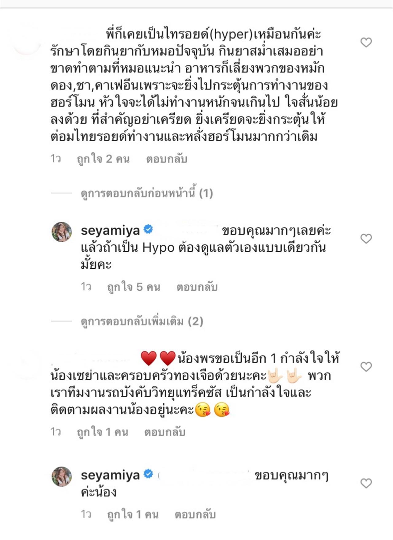 ซึ่งก็มีชาวเน็ตเข้ามาคอมเมนต์ให้กำลังใจครอบครัวพีท ทองเจือ และน้องเซย่า อย่างมากมาย พร้อมทั้งยังแนะนำวิธีการรักษาไทรอยด์ให้กับน้องเซย่าเป็นจำนวนมาก ซึ่ง เจ็ง วิไลลักษณ์ ก็ได้เข้ามาคอมเมนต์ขอบคุณและแลกเปลี่ยนความคิดเห็น.