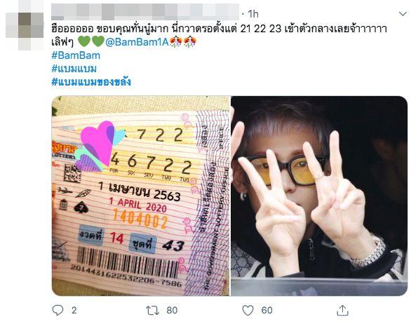 แม้งวดนี้จะมีคนถูกน้อยไปนิด เพราะส่วนมากจะซื้อเลข 23 ซึ่งเป็นอายุของ แบมแบม รวมไปถึงเลข 97 ซึ่งเป็นเลขปีเกิดของแบมแบม แต่งานนี้อากาเซก็ได้ค่าขนมติดไม้ติดมือกลับบ้านไปเบาๆ หลายคนเหมือนกัน.