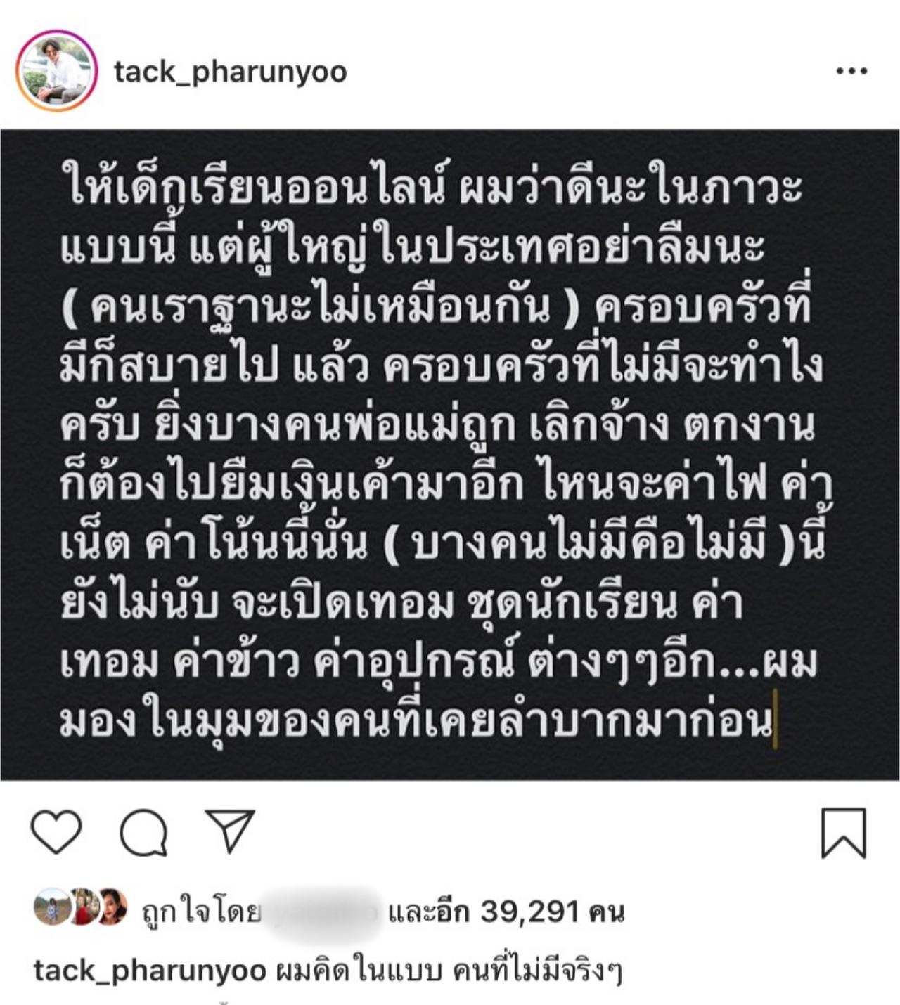 ล่าสุด คุณพ่อลูกหนึ่ง แทค ภรัณยู ก็เป็นอีกคนที่ออกมาเสนออีกหนึ่งมุมมองของเรื่องเรียนออนไลน์ผ่านทางอินสตาแกรมส่วนตัวของตัวเอง โดยหนุ่มแทคโพสต์ข้อความว่า