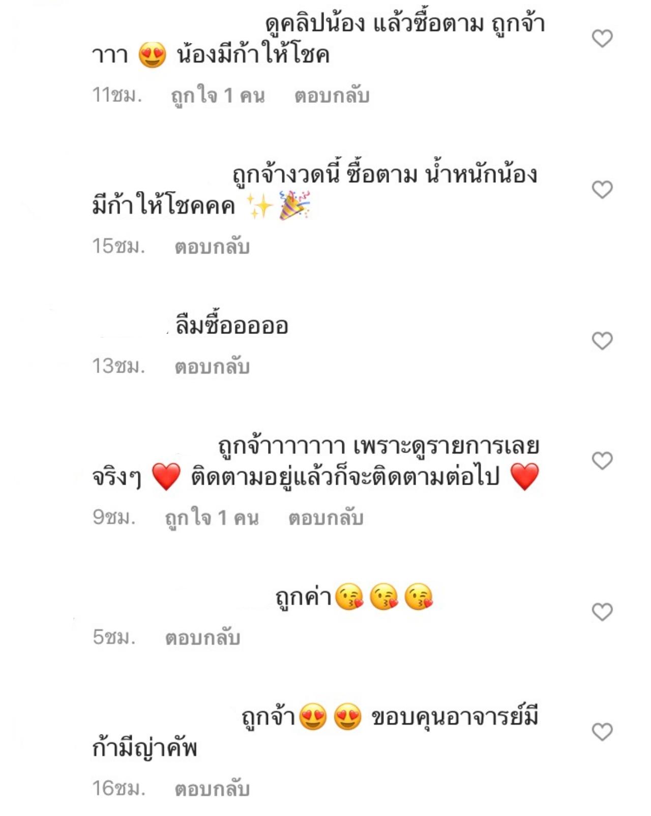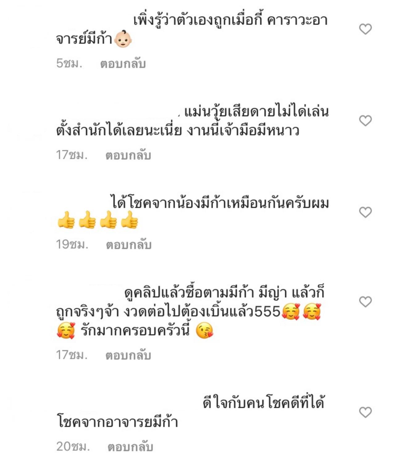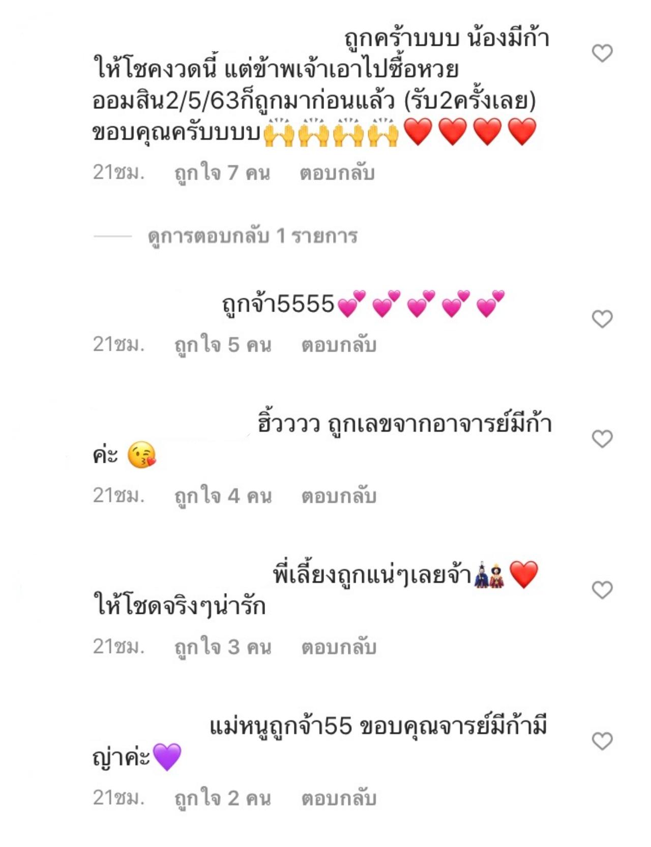 ด้าน มาร์กี้ ก็ได้โพสต์ไอจีสตอรี่ พร้อมกับเขียนว่า "อาจารย์มีก้ามีญ่ามาทุกงวดจริงๆ" ซึ่งแฟนคลับแห่คอมเมนต์ขอบคุณกันรัวๆ ที่ทำให้ถูกเลขเด็ด และเข้ามาคอมเมนต์เป็นเสียงเดียวกันว่า ขอบคุณอาจารย์มีก้า-มีญ่า เพราะดูคลิปและซื้อเลขตาม ทำให้ถูกรางวัลมีเงินใช้แล้ว แม่นขนาดนี้ งวดหน้าเจอกันนะจ๊ะ.