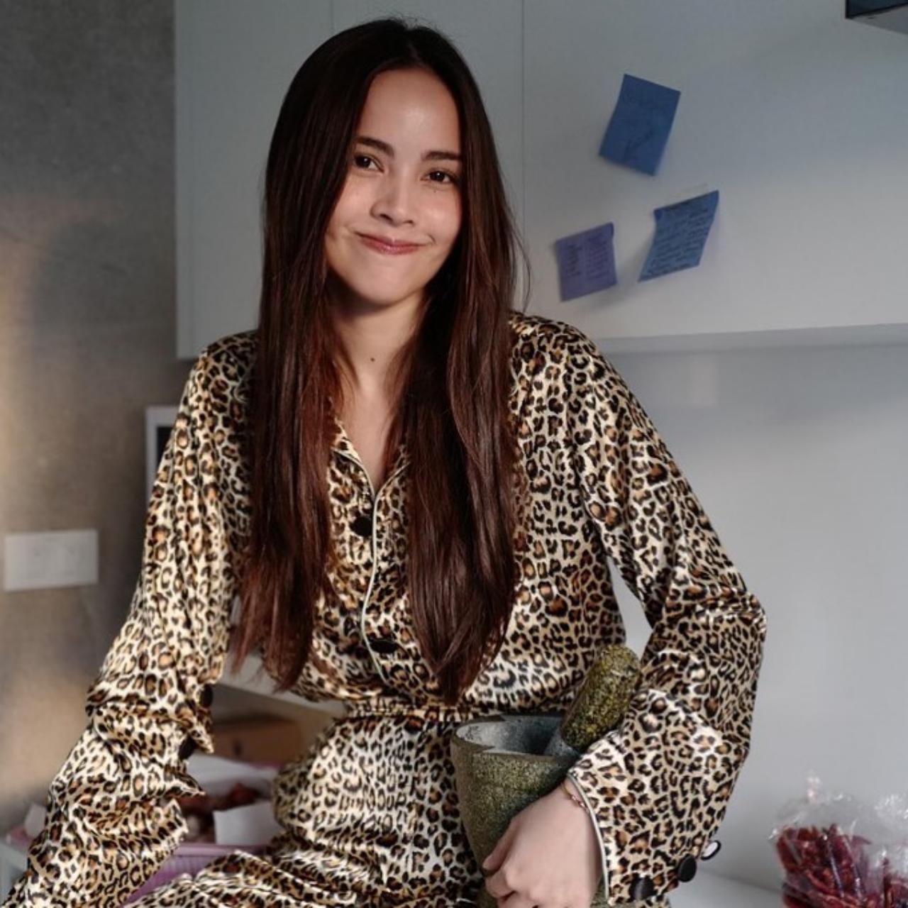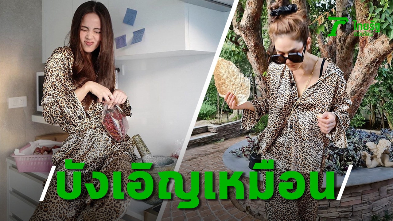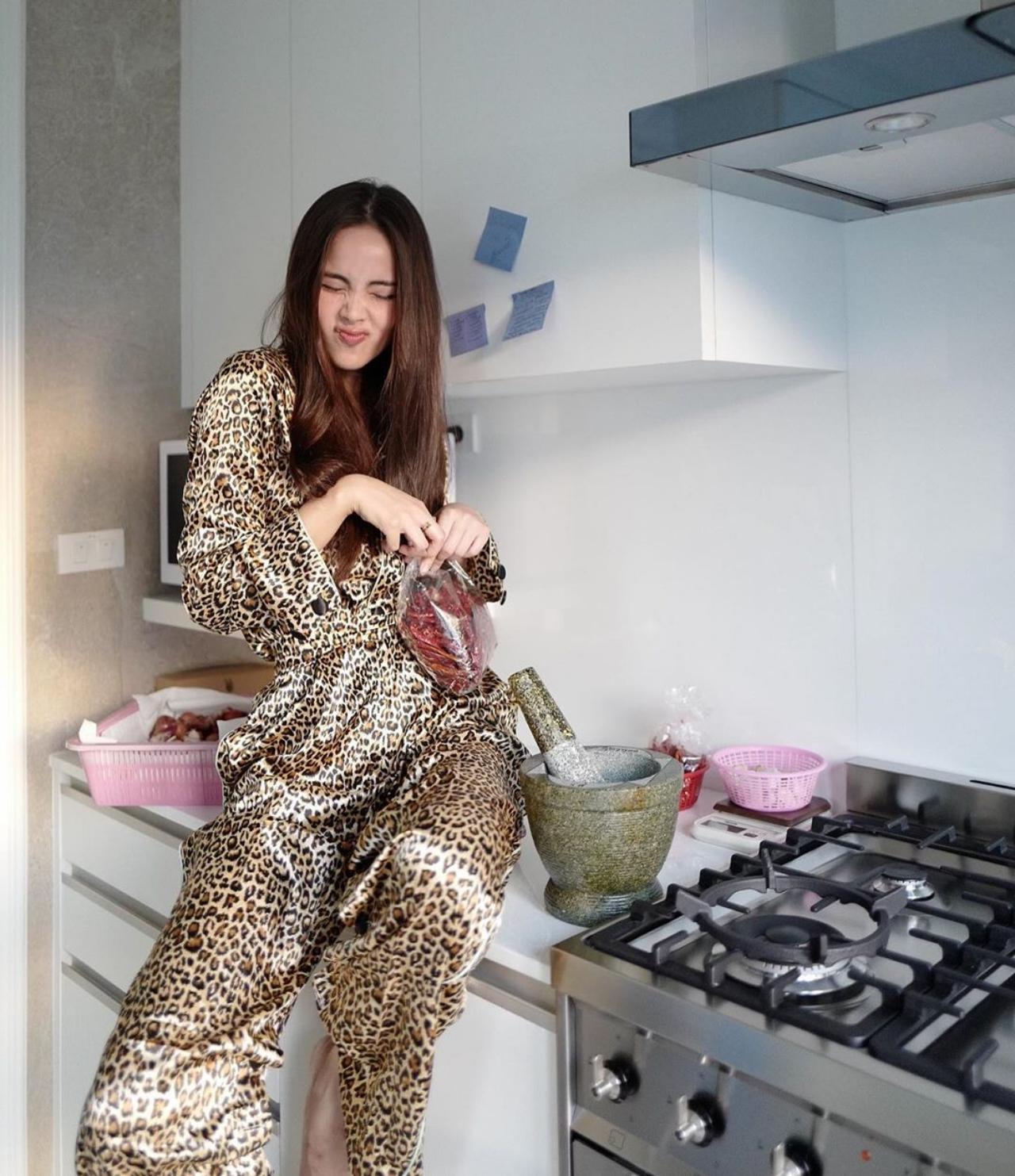 ส่วนสาว ญาญ่า อุรัสยา นั้นก็ใส่ชุดลายเสือแบรนด์เดียวกันเข้าครัวเตรียมทำน้ำพริก แต่สไตล์ของสาวญาญ่านั้นแอบเรียบร้อยด้วยการติดกระดุมครบทุกเม็ดแถมยังนุ่งทับเรียบร้อยดูน่ารักไปอีกแบบ