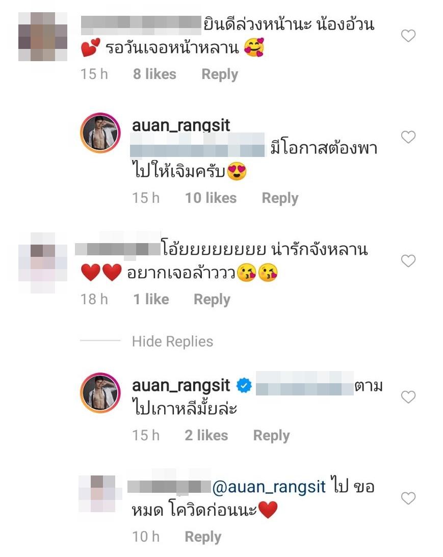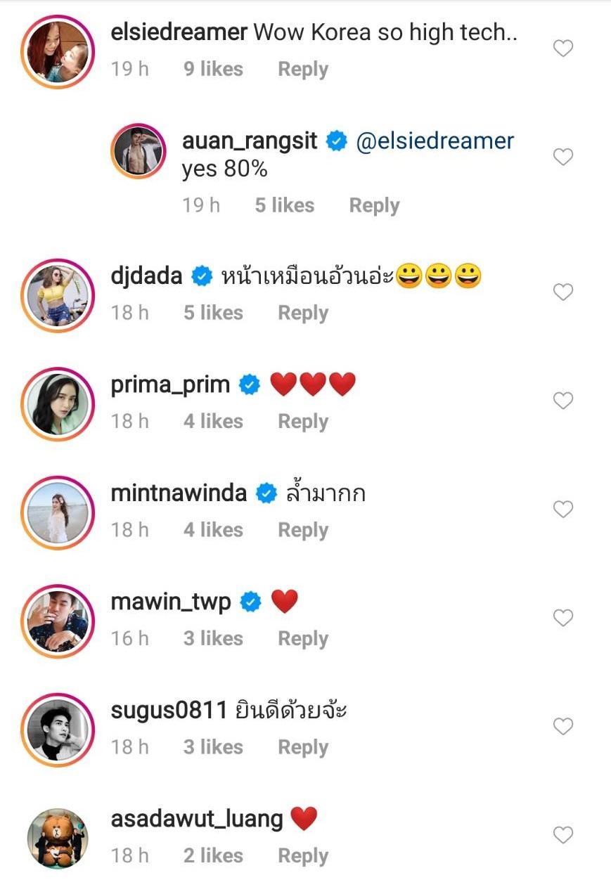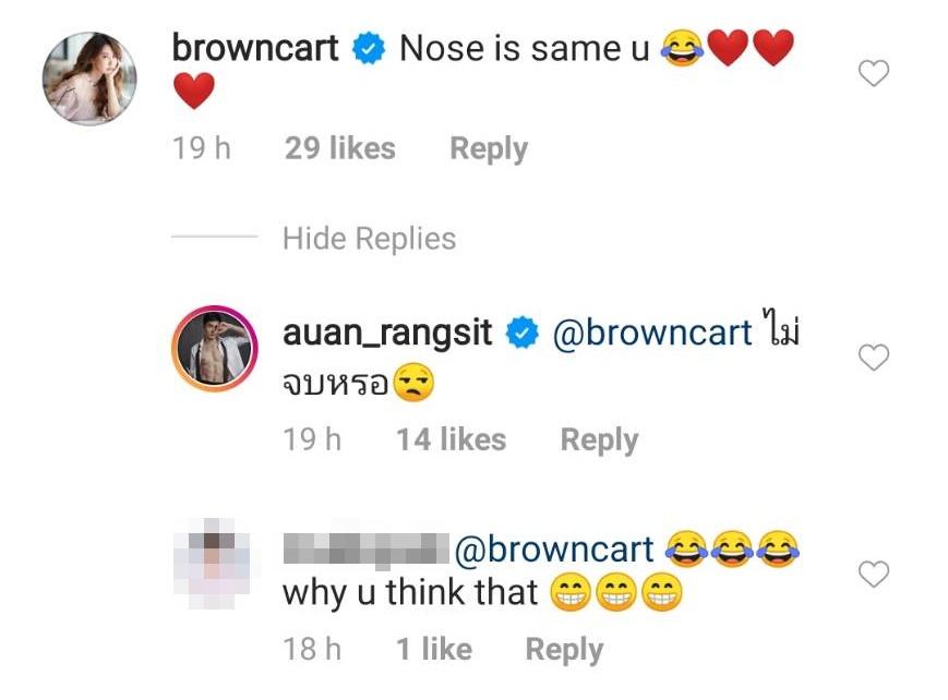 ด้าน มะม่วง คอมเมนต์แซวว่า "Nose is same u" พร้อมทั้งใส่อีโมจิขำน้ำตาไหลกับอีโมจิรูปหัวใจ และ อ้วน รังสิต ตอบกลับว่า "ไม่จบหรอ" และใส่อีโมจิหน้าเซ็งแบบฮาๆ ด้วย.