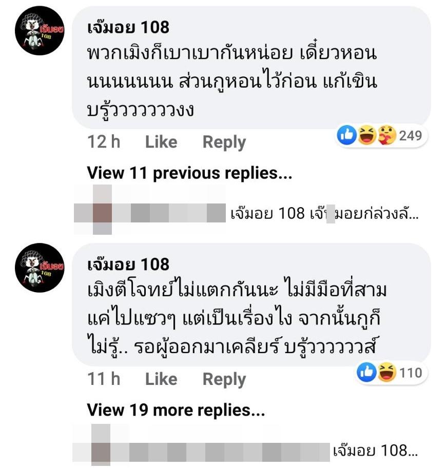 พร้อมทั้งเขียนข้อความเพิ่มเติมว่า “พวกเมิงก็เบาเบากันหน่อย เดี๋ยวหอนนนนนนนน ส่วนกูหอนไว้ก่อน แก้เขิน บรู้วววววววงง” และ “เมิงตีโจทย์ไม่แตกกันนะ ไม่มีมือที่สาม แค่ไปแซวๆ แต่เป็นเรื่องไง จากนั้นกูก็ไม่รู้.. รอผู้ออกมาเคลียร์ บรู้ววววววส์”