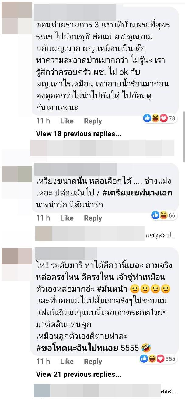 -จริงๆ ก็เลิกแหละ แค่รอฝ่ายชายเฟิร์ม เพราะเห็นว่าครอบครัวเชียร์ให้คบกับผู้หญิงอีกคน สวยมั้ยหรา? ก็น่ารักดี มีธุรกิจเล็กๆ เป็นของตัวเอง ก็เห็นช่วยกันโปรโมตอยู่นะ