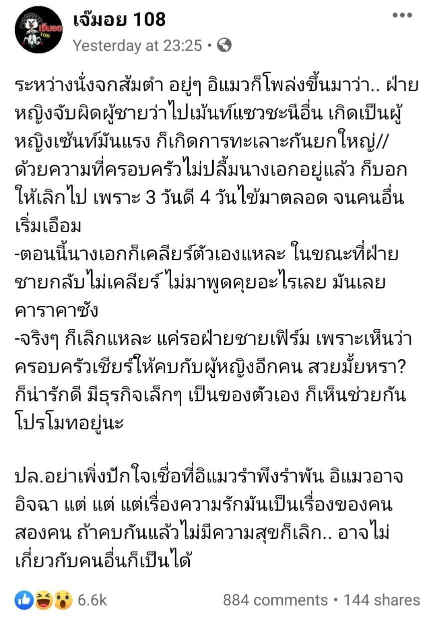 ล่าสุด เพจบันเทิงดัง เจ๊มอย 108 ได้โพสต์ข่าวเม้าท์ถึงเรื่องนี้ว่า “ระหว่างนั่งจกส้มตำ อยู่ๆ อิแมวก็โพล่งขึ้นมาว่า.. ฝ่ายหญิงจับผิดผู้ชายว่าไปเมนต์แซวชะนีอื่น เกิดเป็นผู้หญิงเซนส์มันแรง ก็เกิดการทะเลาะกันยกใหญ่ // ด้วยความที่ครอบครัวไม่ปลื้มนางเอกอยู่แล้ว ก็บอกให้เลิกไป เพราะ 3 วันดี 4 วันไข้มาตลอด จนคนอื่นเริ่มเอือม