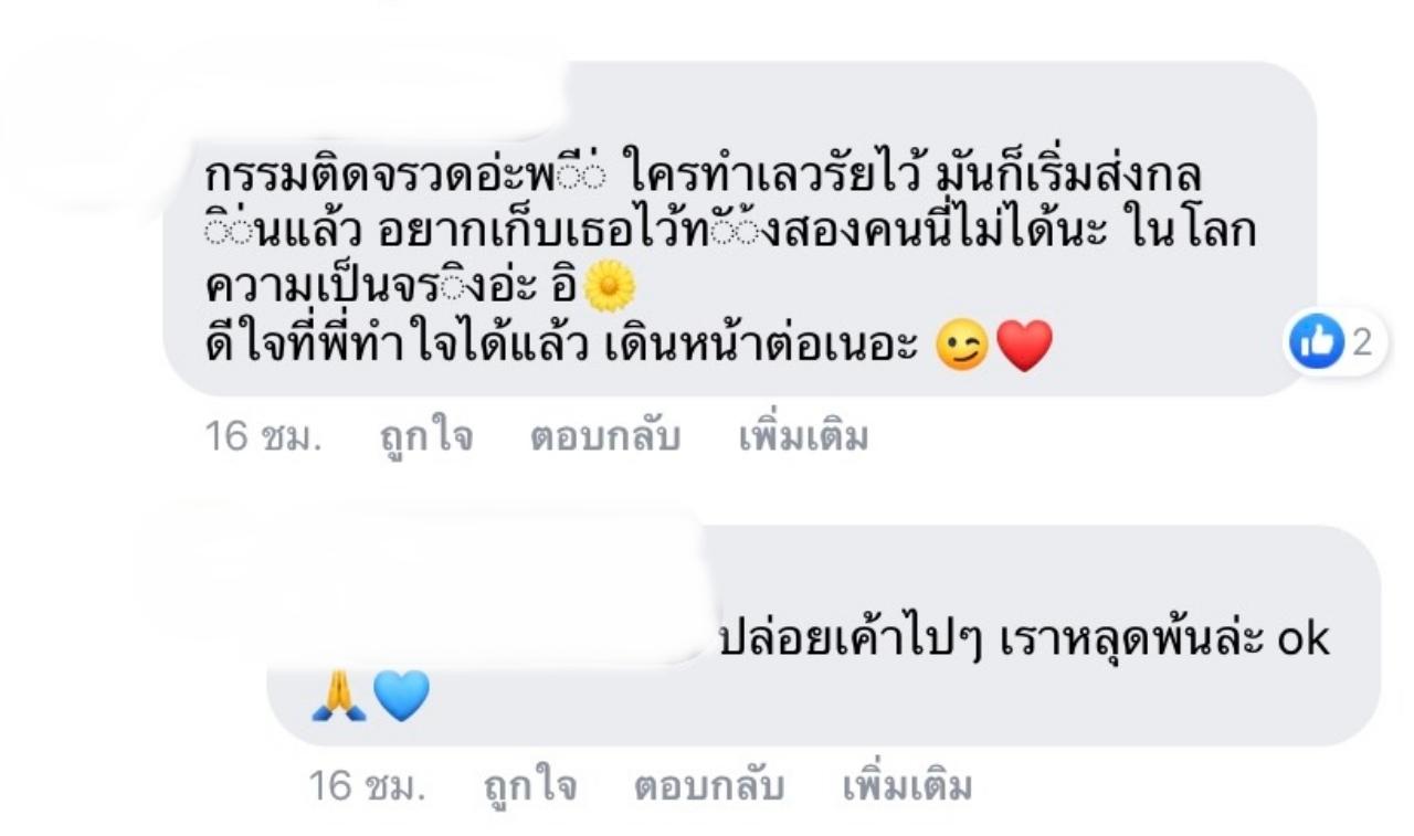 ขณะเดียวก็มีชาวเน็ตอ้างข้อความจากเฟซบุ๊กที่หญิงสาวคนที่ถูกอ้างเป็นแฟนเก่าของสาวหล่อได้โพสต์และความคอมเมนต์ว่า "แผลนี้ ต้องดังแน่เลย", "โอ๊ะ โอ โอ โอยย น่ากลัวจังเลย !", "555555 ไบซิเคิลสีแดง", "กรรมติดจรวดอ่ะพี่ ใครทำเลวรัยไว้ มันก็เริ่มส่งกลิ่นแล้ว อยากเก็บเธอไว้ทั้งสองคนนี่ไม่ได้นะ ในโลกความเป็นจริงอ่ะ อิ... ดีใจที่พี่ทำใจได้แล้ว เดินหน้าต่อเนอะ"