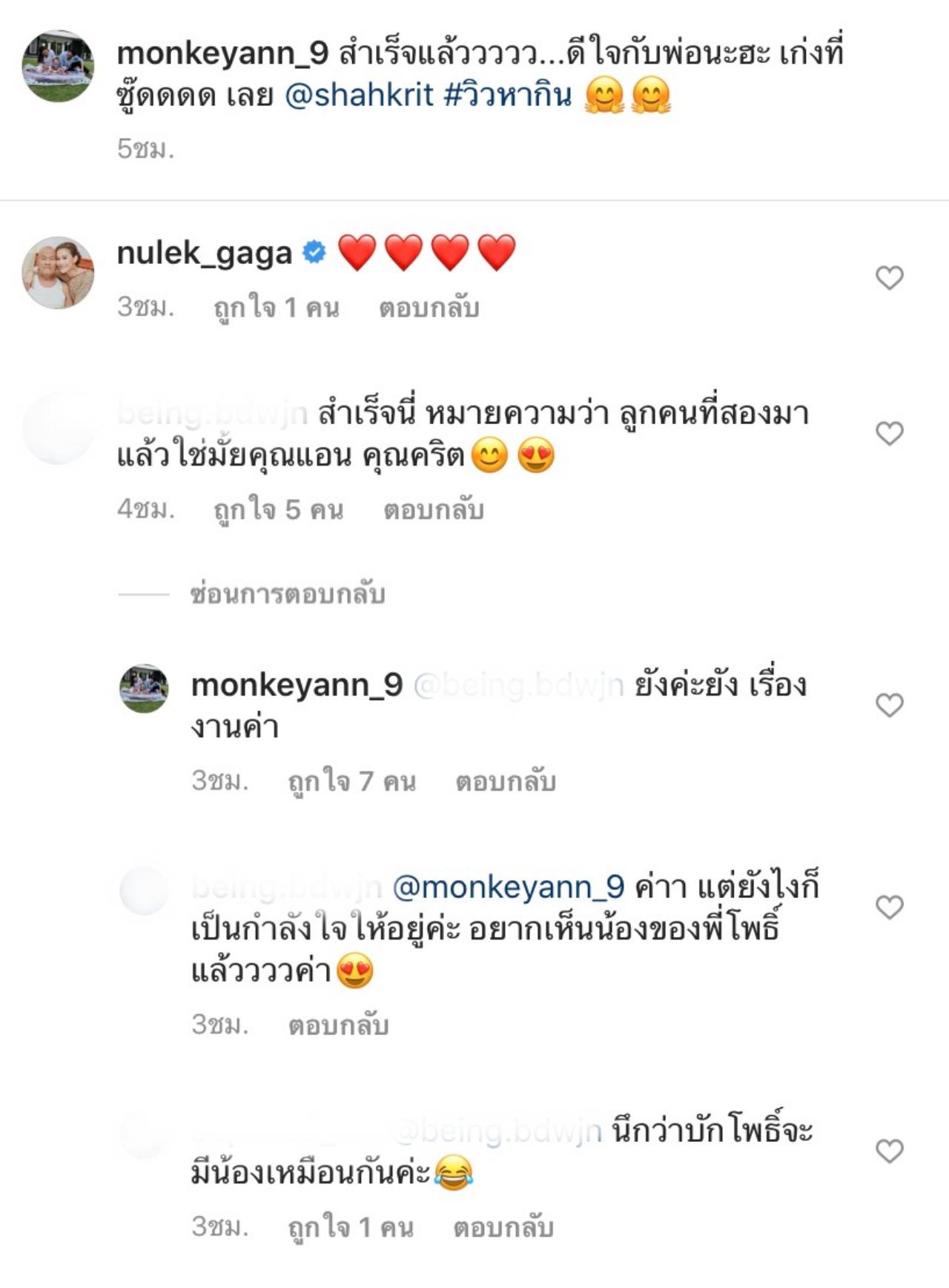 ซึ่งสาวแอนก็รีบเข้ามาตอบทันทีว่า “ยังค่ะยัง เรื่องงานค่า” ซึ่งก็มีชาวเน็ตเข้ามาคอมเมนต์ต่อว่า “นึกว่าบักโพธิ์จะมีน้องเหมือนกันค่ะ” เรียกว่าหลายคนก็ยังลุ้นและเอาใจช่วยให้ทั้งคู่สมหวังกับการที่จะมีลูกคนที่สอง มีน้องให้กับน้องโพธิ์กันอย่างมากมาย