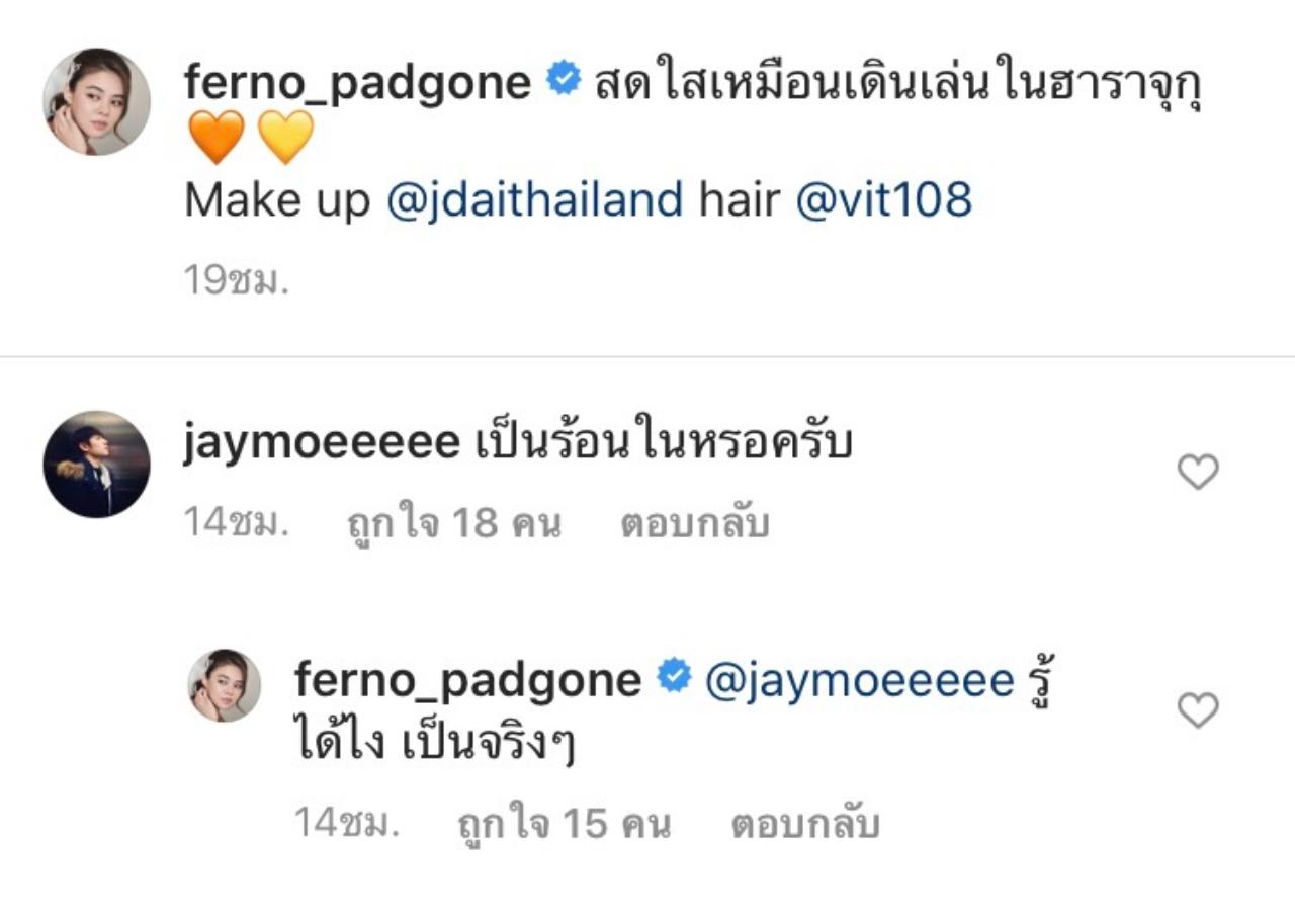 ล่าสุด ใบเฟิร์น ก็ได้ลงภาพตัวเองพร้อมกับเขียนแคปชั่นว่า "สดใสเหมือนเดินเล่นในฮาราจุกุ" ซึ่งมีเพื่อนๆ และคนที่ติดตามต่างเข้ามาคอมเมนต์ชมในความน่ารักมุ้งมิ้งของ ใบเฟิร์น และ เจโม่ ก็ได้เข้ามาคอมเมนต์แซวด้วยเช่นกัน โดยบอกว่า "เป็นร้อนในหรอครับ" และ ใบเฟิร์น ก็ได้เข้ามาตอบกลับว่า "รู้ได้ไง เป็นจริงๆ".
