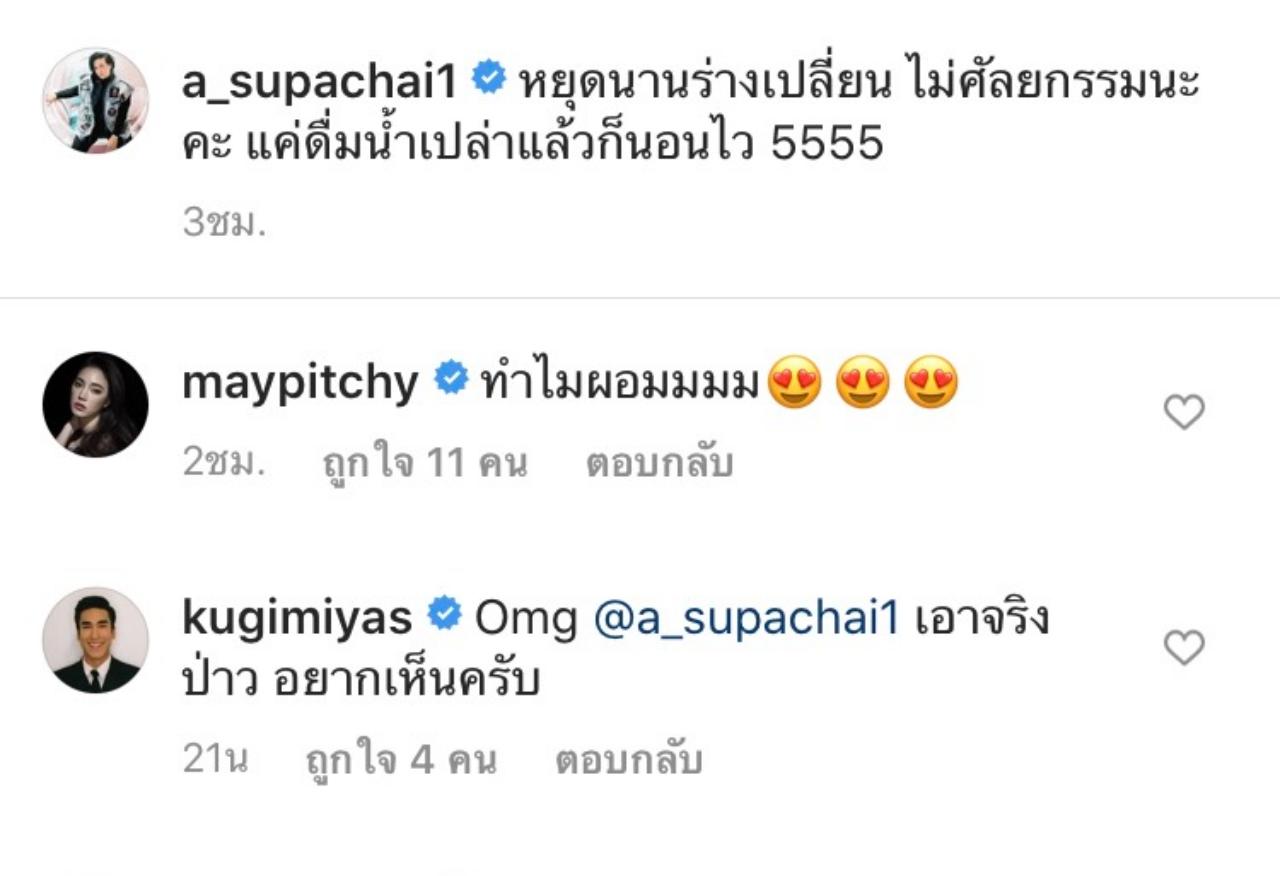 งานนี้น้องๆ คนดังในวงการบันเทิง รวมถึงหนุ่ม ณเดชน์ คูกิมิยะ ก็ได้เข้ามาคอมเมนต์ว่า "Omg @a_supachai1 เอาจริงป่าว อยากเห็นครับ" ด้าน เมย์ พิชญ์นาฏ ก็ได้เข้ามาถามว่า "ทำไมผอมมมม"