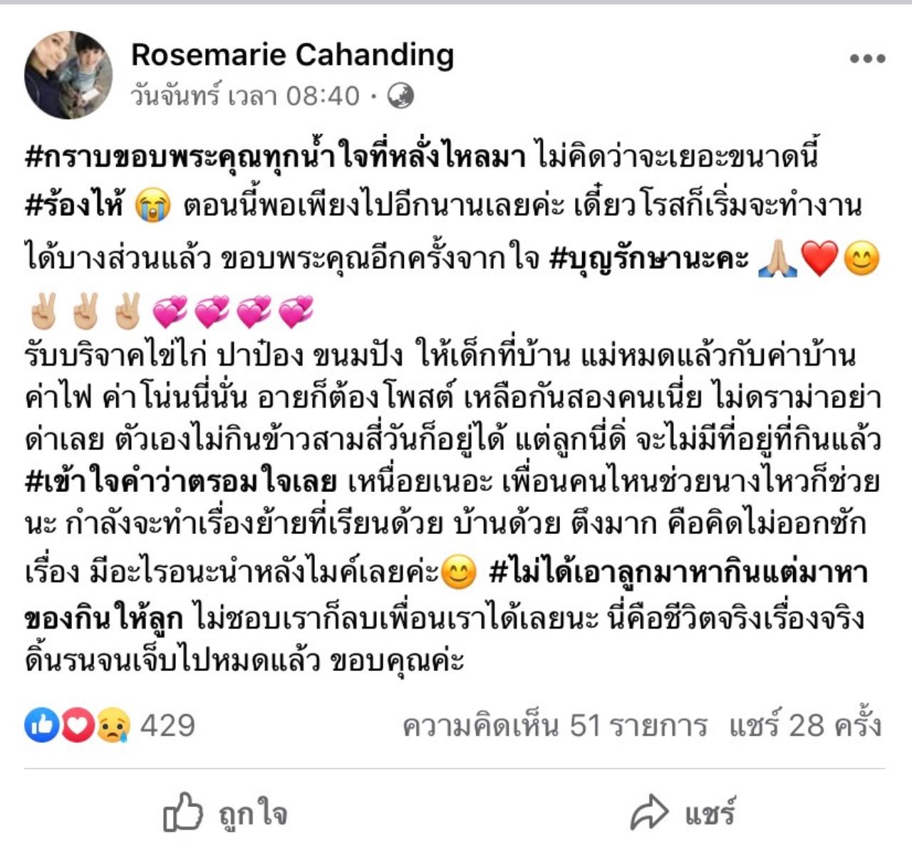 #กราบขอบพระคุณทุกน้ำใจที่หลั่งไหลมา ไม่คิดว่าจะเยอะขนาดนี้ #ร้องไห้ ตอนนี้พอเพียงไปอีกนานเลยค่ะ เดี๋ยวโรสก็เริ่มจะทำงานได้บางส่วนแล้ว ขอบพระคุณอีกครั้งจากใจ #บุญรักษานะคะ”