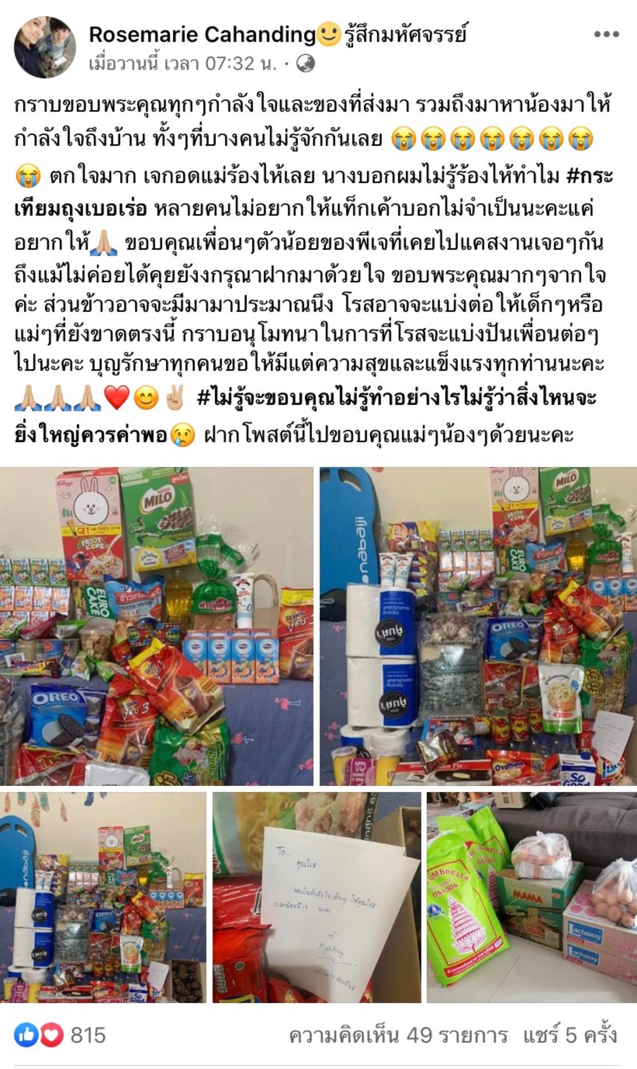 หลังจากที่อดีตนักร้องสาวได้โพสต์ข้อความดังกล่าวไป ก็มีคนยื่นมือเข้ามาช่วยเหลือบริจาคข้าวสารอาหารแห้งและขนมให้โรสแมรี่และลูกชายน้องพีเจเป็นจำนวนมาก ซึ่งเจ้าตัวก็โพสต์ขอบคุณทุกคนว่า