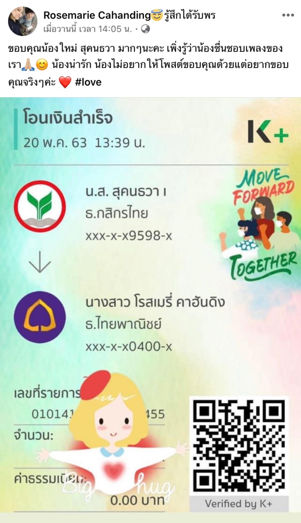 และนักแสดงสาว ใหม่ สุคนธวา หลังจากที่ทราบเรื่องดังกล่าว ก็ได้โอนเงินไปช่วยอดีตนักร้องสาว โรสแมรี่และลูกชายเป็นเงินจำนวนหนึ่ง ซึ่งเจ้าตัวก็ได้โพสต์ขอบคุณผ่านเฟซบุ๊กอีกด้วย
