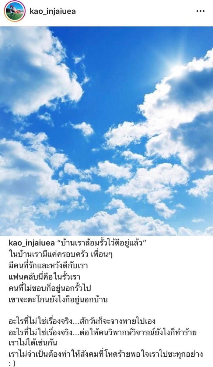 ล่าสุด ข้าว นันทกานต์ พี่สาวของกัน นภัทร ก็ได้โพสต์ภาพท้องฟ้าสวยสดใส พร้อมทั้งเขียนข้อความปกป้องน้องชายของตนเองว่า “บ้านเราล้อมรั้วไว้ดีอยู่แล้ว” ในบ้านเรามีแค่ครอบครัว เพื่อนๆ มีคนที่รักและหวังดีกับเรา แฟนคลับนี่คือในรั้วเรา คนที่ไม่ชอบก็อยู่นอกรั้วไป เขาจะตะโกนยังไงก็อยู่นอกบ้าน