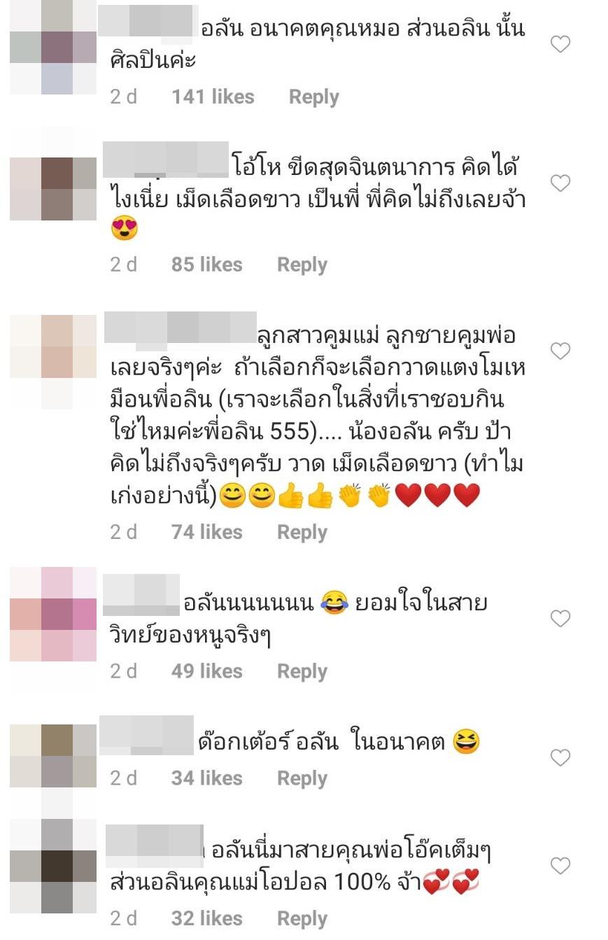ทำเอาชาวโซเชียลหลายคนคอมเมนต์กันเพียบ อาทิ อลัน อนาคตคุณหมอ ส่วนอลินนั้นศิลปิน, ขีดสุดจินตนาการ คิดได้ไงเนี่ย เม็ดเลือดขาว, อลันมาสายคุณพ่อโอ๊คเต็มๆ ส่วนอลินสายคุณแม่โอปอล์, อลันจินตนาการล้ำมาก ฯลฯ