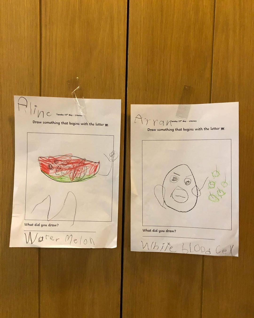 โดย หมอโอ๊ค โพสต์ภาพผลงานการวาดรูปของลูกๆ ที่งานนี้ น้องอลิน วาดรูปแตงโม แต่ที่ทำให้หลายคนร้องว้าวคือ น้องอลัน วาดรูปเม็ดเลือดขาว พร้อมทั้งเขียนแคปชั่น “เรียน online วันนี้ ถึงตัว W ครับ ใกล้ปิดเทอมแล้ว ให้เลือกว่าจะวาดอะไรขึ้นต้นด้วย W อลินเลือก แตงโม อลันเลือก เม็ดเลือดขาว ครับ 5555555 #aline_a #arran_a #arayaskul”