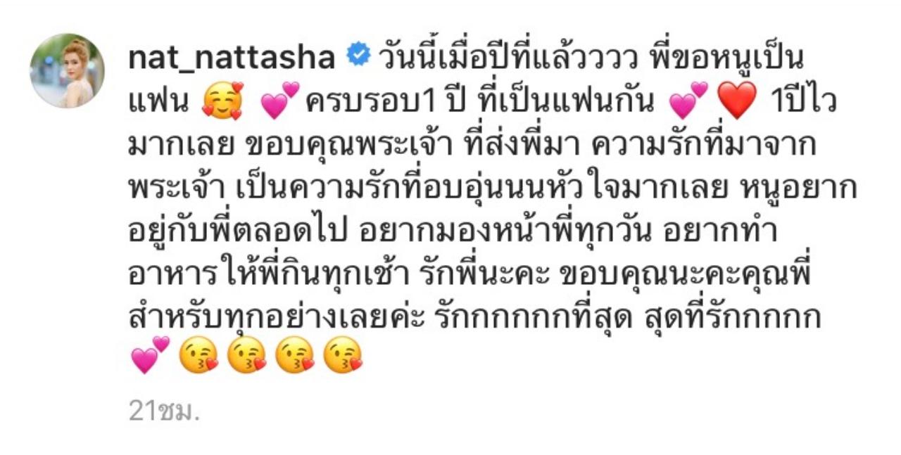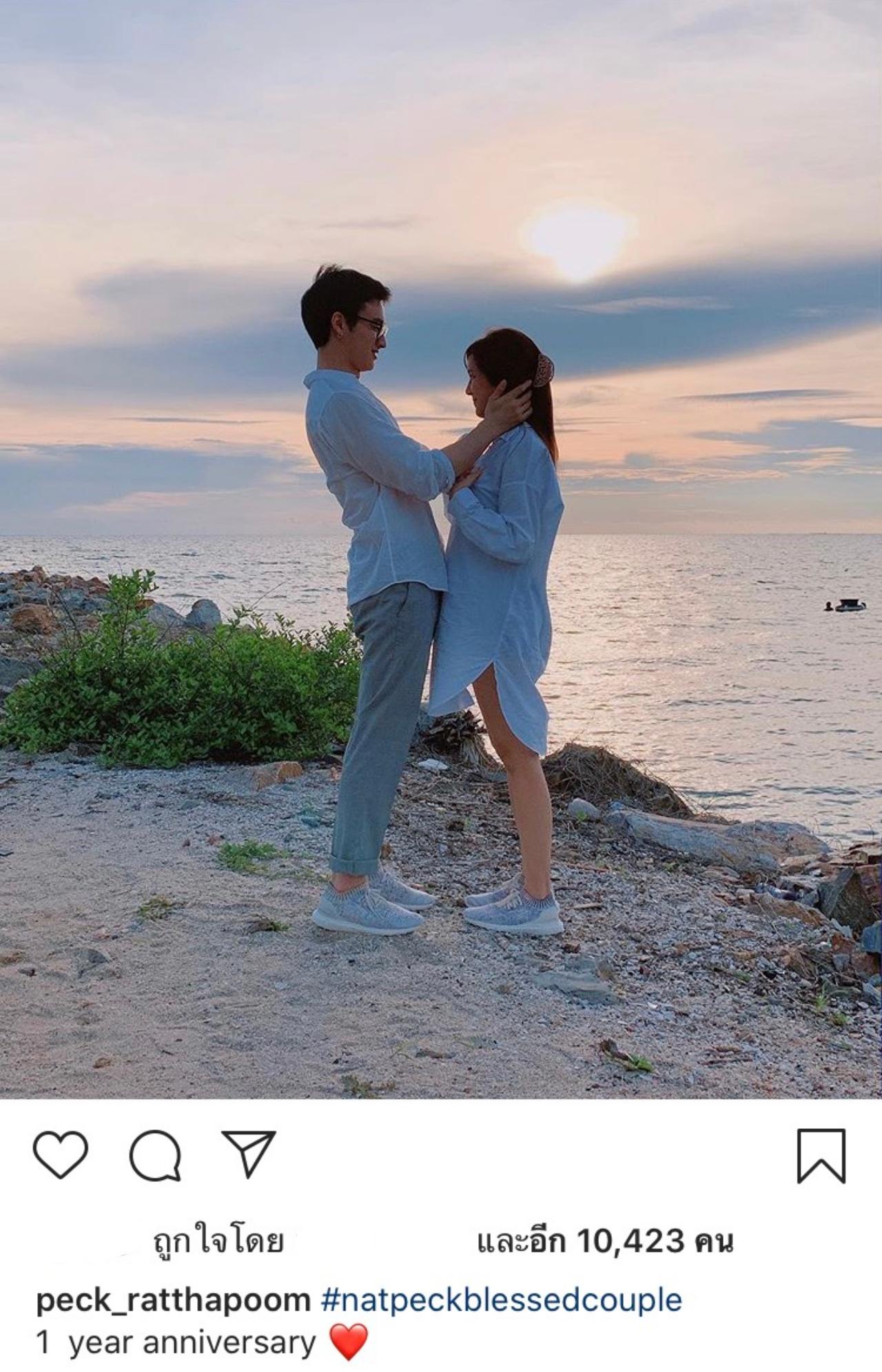 ทางด้านสามีหนุ่ม เป๊ก รัฐภูมิ ก็ได้โพสต์ภาพพร้อมกับเขียนข้อความสุดหวานเช่นกันว่า "#natpeckblessedcouple 1 year anniversary"