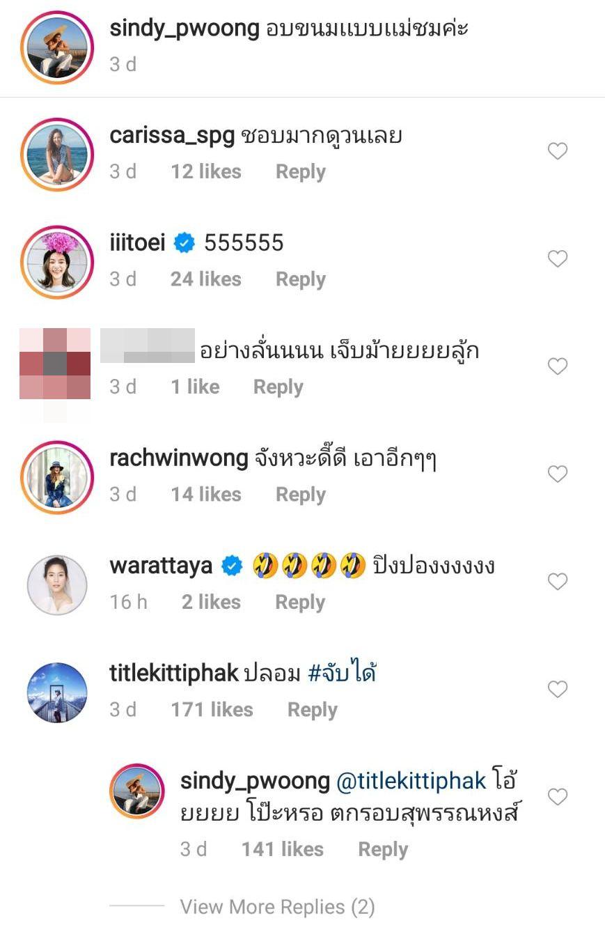 งานนี้นอกจากจะมีแฟนๆ คอมเมนต์ขำหนักมากเต็มไอจีแล้ว ยังมีคนบันเทิงแซวหลายคน อาทิ ก้อย รัชวิน “จังหวะดี๊ดี เอาอีกๆๆ”, คารีสา สปริงเก็ตต์ “ชอบมากดูวนเลย”, อาย กมลเนตร “ทุ่มเท” แต่ที่ฮาสุดเห็นจะเป็น ไตเติ้ล กิตติภัค ผู้กำกับซีรีส์ไดอารี่ตุ๊ดซี่ส์ ที่คอมเมนต์แซวว่า “ปลอม #จับได้” และ ปิงปอง ตอบกลับว่า “โอ้ยยยย โป๊ะหรอ ตกรอบสุพรรณหงส์”.