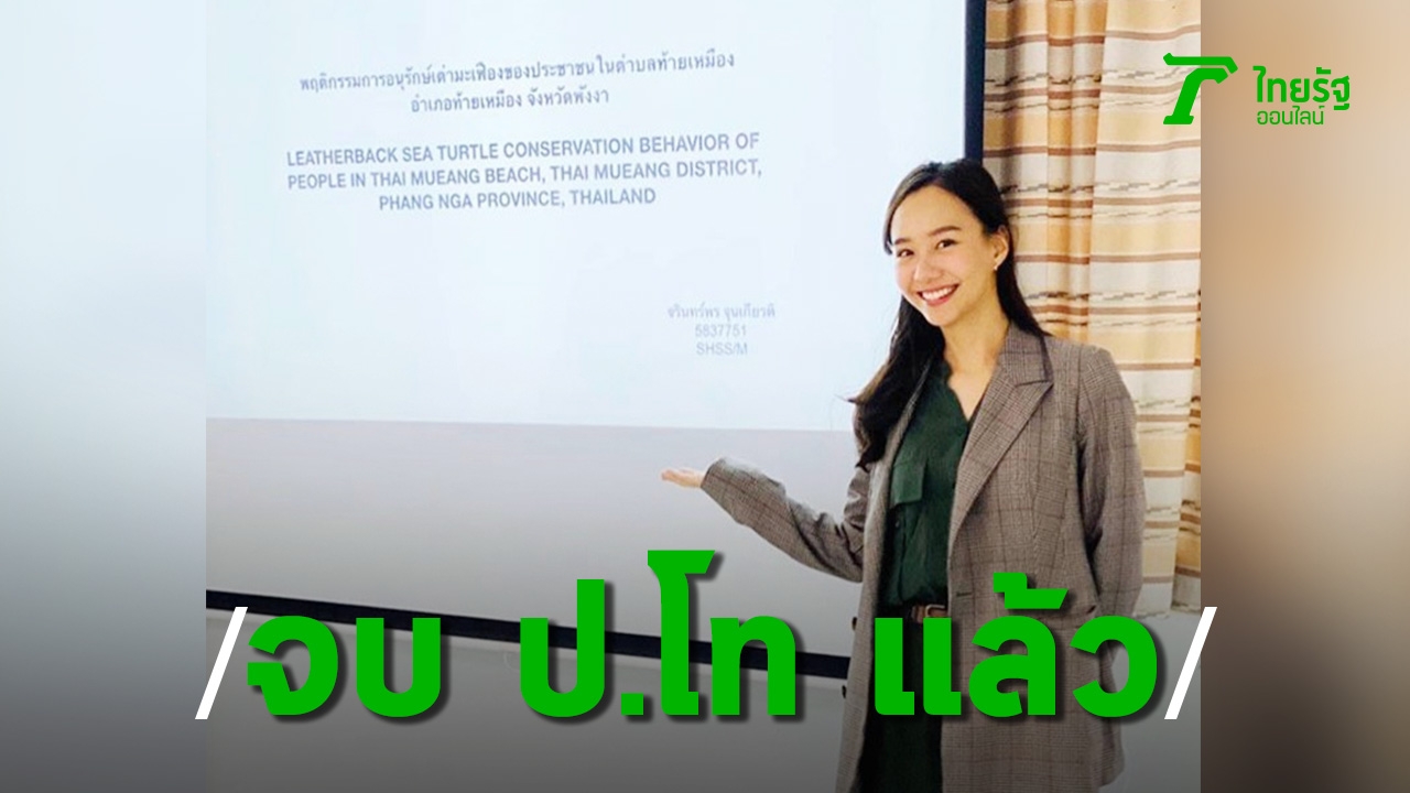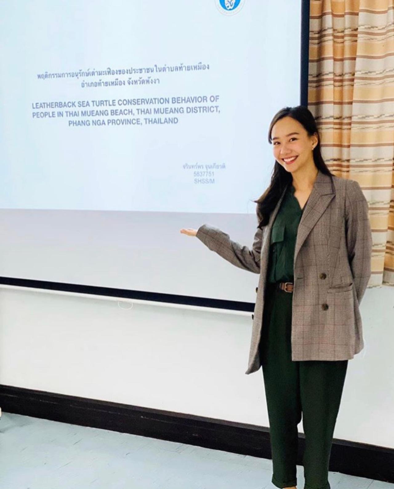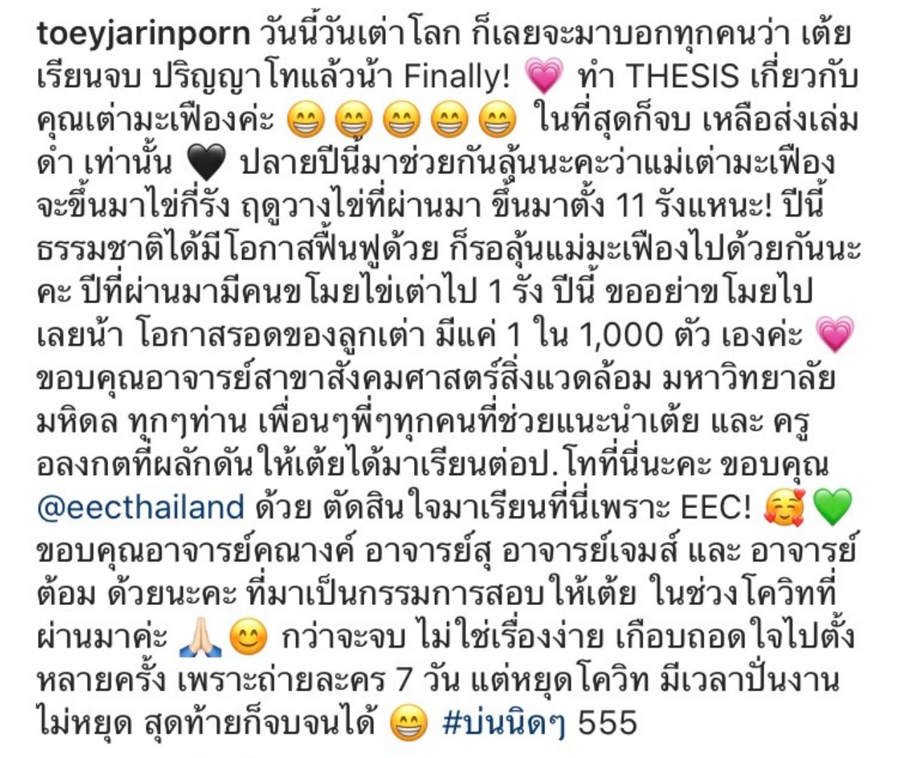 พร้อมกับเขียนข้อความว่า ตนเองเรียนจบแล้ว และได้ทำวิทยานิพนธ์เกี่ยวกับเต่ามะเฟือง พร้อมกับบอกว่า กว่าจะเรียนจบไม่ใช่เรื่องง่ายเลย ตนเองได้ถอดใจไปหลายครั้งมาก เพราะถ่ายละคร 7 วัน แต่ช่วงที่หยุดโควิด-19 เลยทำให้มีเวลามาทำวิทยานิพนธ์จนจบจนได้