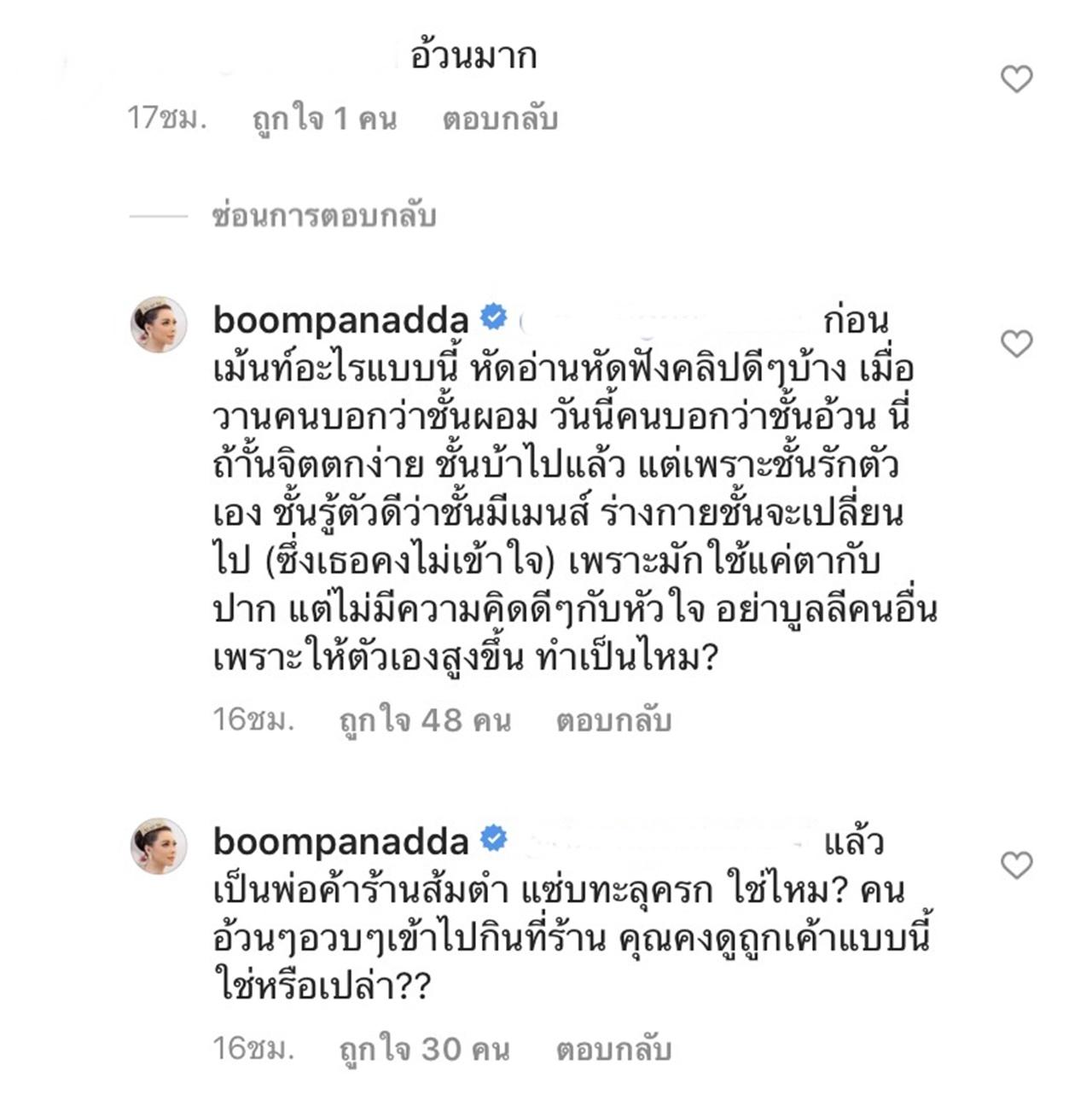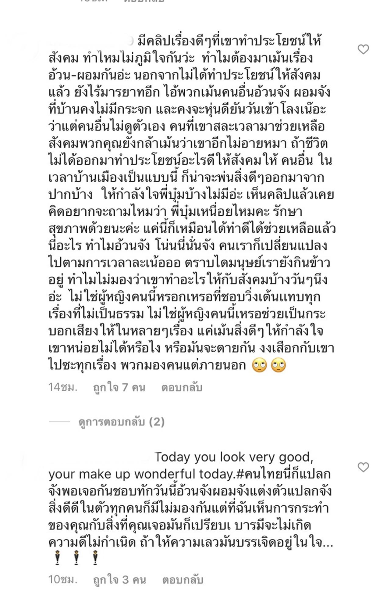 และ "แล้วเป็นพ่อค้าร้านส้มตำ แซ่บทะลุครก ใช่ไหม? คนอ้วนๆอวบๆเข้าไปกินที่ร้าน คุณคงดูถูกเค้าแบบนี้ใช่หรือเปล่า??" จากนั้นก็มีชาวเน็ตเข้ามาคอมเมนต์ตอบโต้กลับชาวเน็ตคนดังกล่าวอย่างดุเดือด พร้อมกับบอกว่า คนทำดีไม่สนใจ มาสนใจเรื่องรูปร่างหน้าตา แทนที่จะคอมเมนต์เพิ่มกำลังใจให้กันน่าจะดีกว่า.