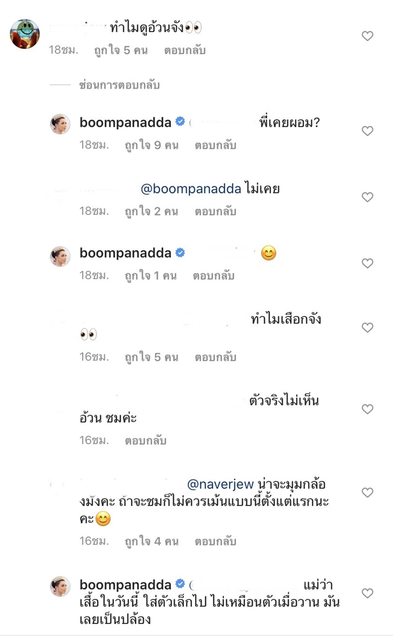หลังจากที่เจ้าตัวโพสต์คลิปดังกล่าวไป ก็มีชาวเน็ตบางคนเข้ามาคอมเมนต์เรื่องรูปร่างของสาวบุ๋มว่า "อ้วนมาก" ซึ่งเจ้าตัวก็ตอบกลับว่า "ก่อนเม้นท์อะไรแบบนี้ หัดอ่านหัดฟังคลิปดีๆบ้าง เมื่อวานคนบอกว่าชั้นผอม วันนี้คนบอกว่าชั้นอ้วน